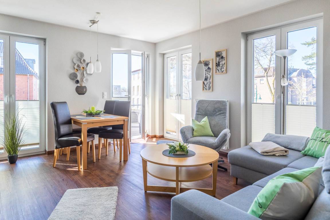 Die rund 56qm große 3-Zimmer-Wohnung im 1.OG eignet sich hervorragend für zwei bis vier Gäste. Die bodentiefen Fenster sorgen für viel Tageslicht.