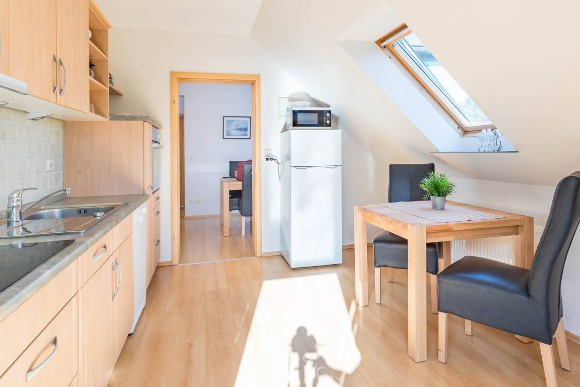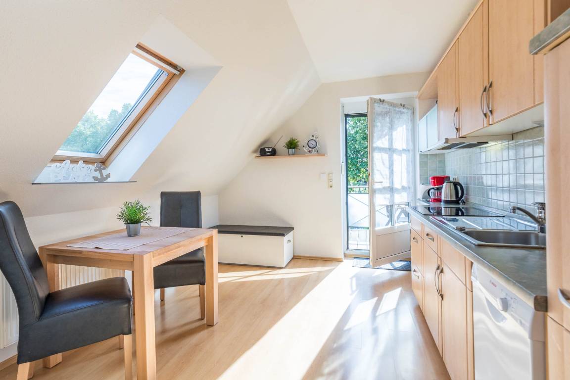 In der räumlich abgeteilten Küche steht jeglicher technischer Komfort bereit: Geschirrspüler, Mikrowelle, Kühlschrank mit Gefrierfach, Kaffeemaschine, Herd bzw. Backofen. Sie beinhaltet ebenfalls einen einladenden Essbereich.