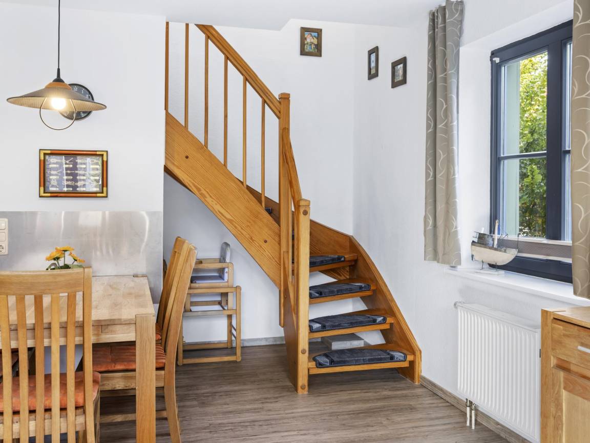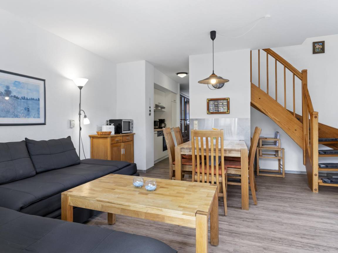 Layout : In der 1. Etage: offene Küche mit Wasserkocher, Toaster, Kochherd, Kaffeemaschine(Filter), Backofen, Mikrowelle, Geschirrspüler, Kühl-/Gefrierkombination , Wohn/Esszimmer mit TV, Esstisch, Sitzecke , Schlafzimmer mit 2x Einzelbett , Badezimmer mit 2x Waschbecken, Dusche, Toilette , Flur