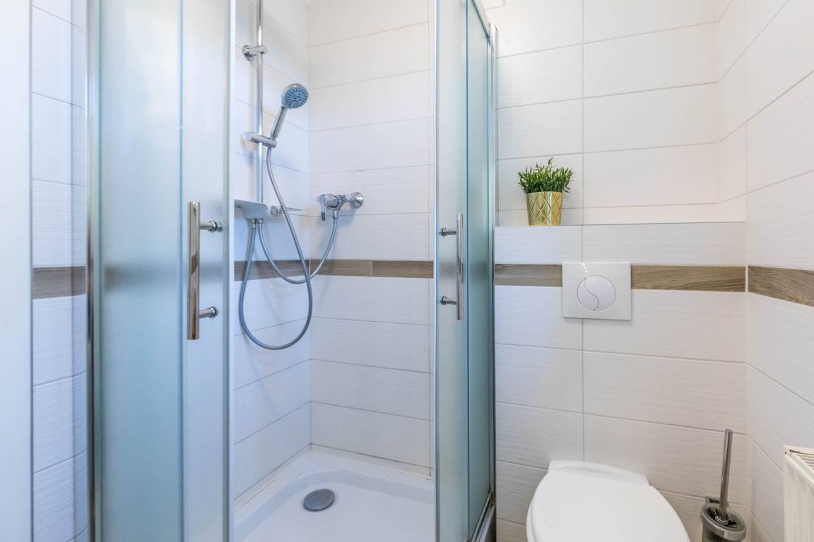 Das Badezimmer befindet sich ebenfalls auf dieser Etage und verfügt neben einer Dusche und einem WC auch über einen Föhn. Hier befindet sich auch eine Waschmaschine, die für unsere Gäste kostenfrei zur Verfügung steht. Das Fenster sorgt für angenehmes Tageslicht und hilft beim Lüften, z.B. nach dem Duschen.