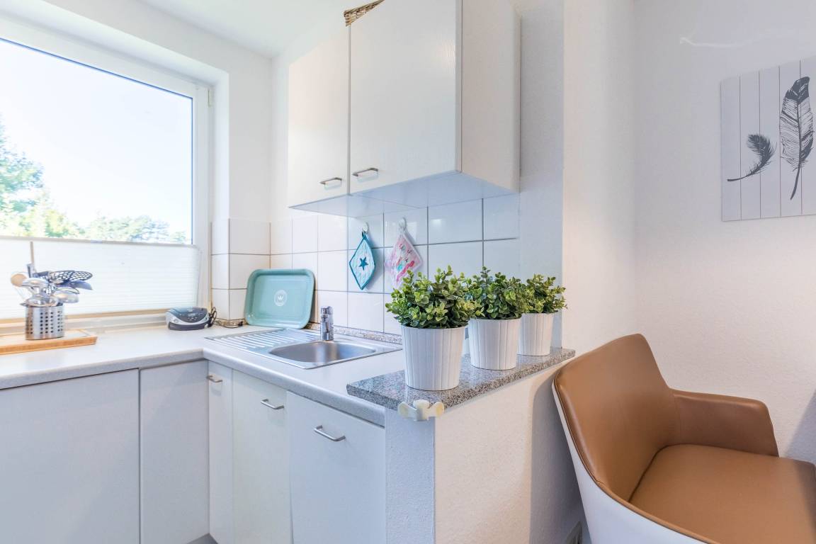 Die Küche ist in dieser Wohnung separat. Hier bieten haushaltsübliche Geräte (Herd mit Backofen, Kaffeemaschine, Wasserkocher, Toaster, Kühlschrank mit Gefrierfach) die Möglichkeit zur Selbstversorgung ohne Einschränkung.