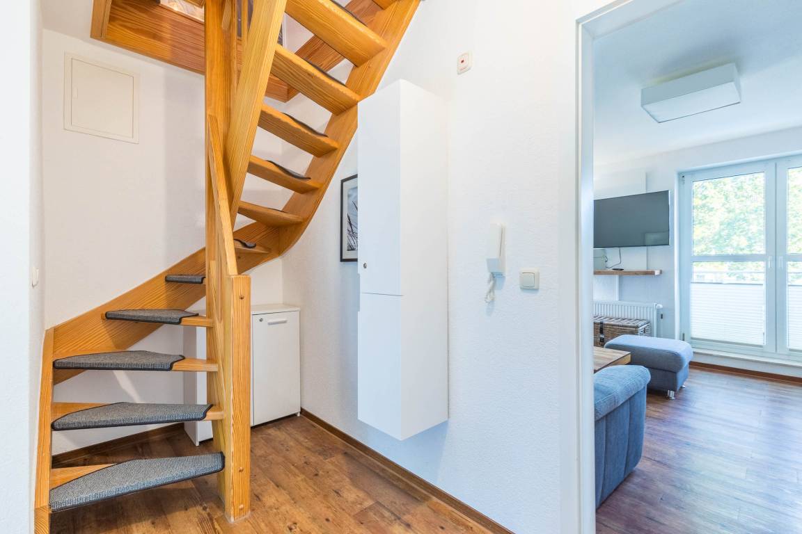 Vom Wohnungsflur aus führt eine Treppe ins Dachgeschoss.