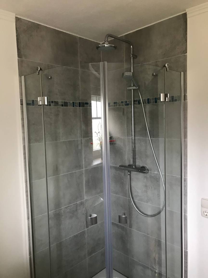 Die bodentiefe Dusche im gefliesten Badezimmer mit Fußbodenheizung erfreut nicht nur Familien. Ein kleines Fenster sorgt für Tageslicht und erleichtert das Lüften nach dem Duschen.