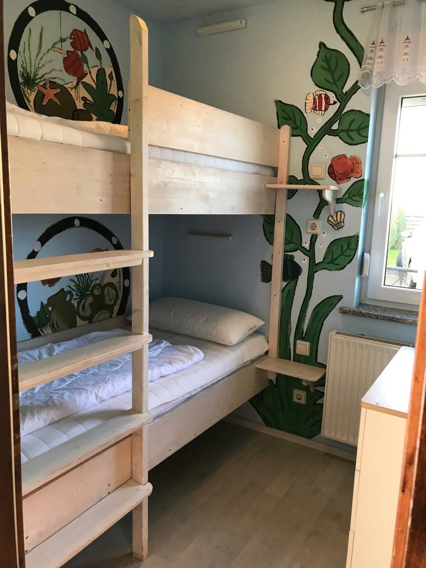 In den zwei separaten Schlafzimmern sorgen bequeme Betten für erholsame Nächte. Das größere Schlafzimmer bietet ein Doppelbett mit Kommoden, im Kinderzimmer finden Sie ein tolles Etagenbett.