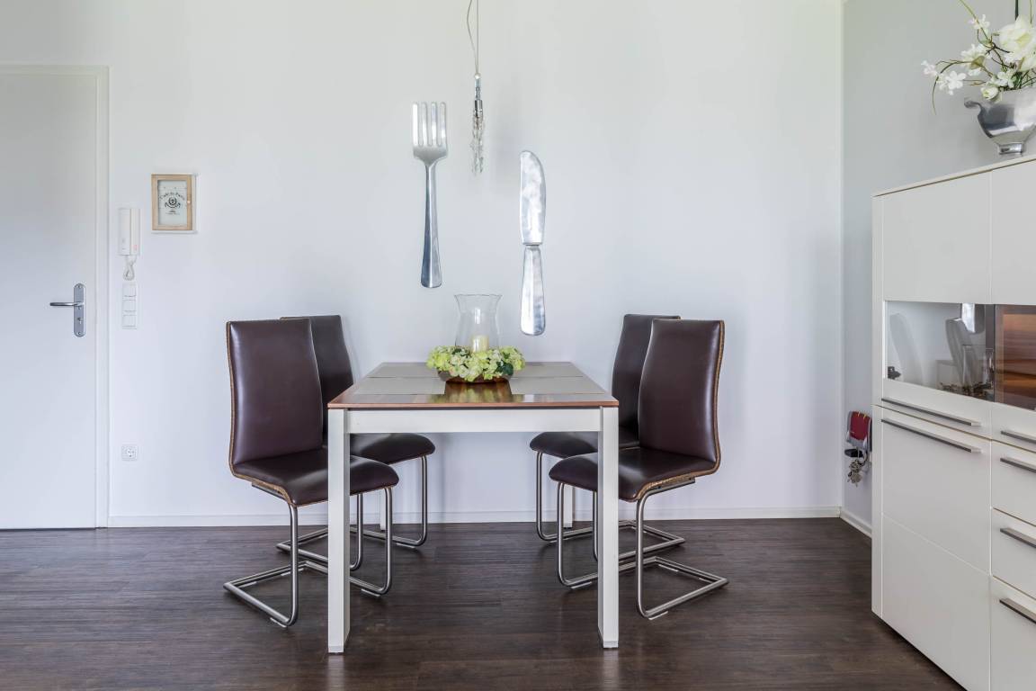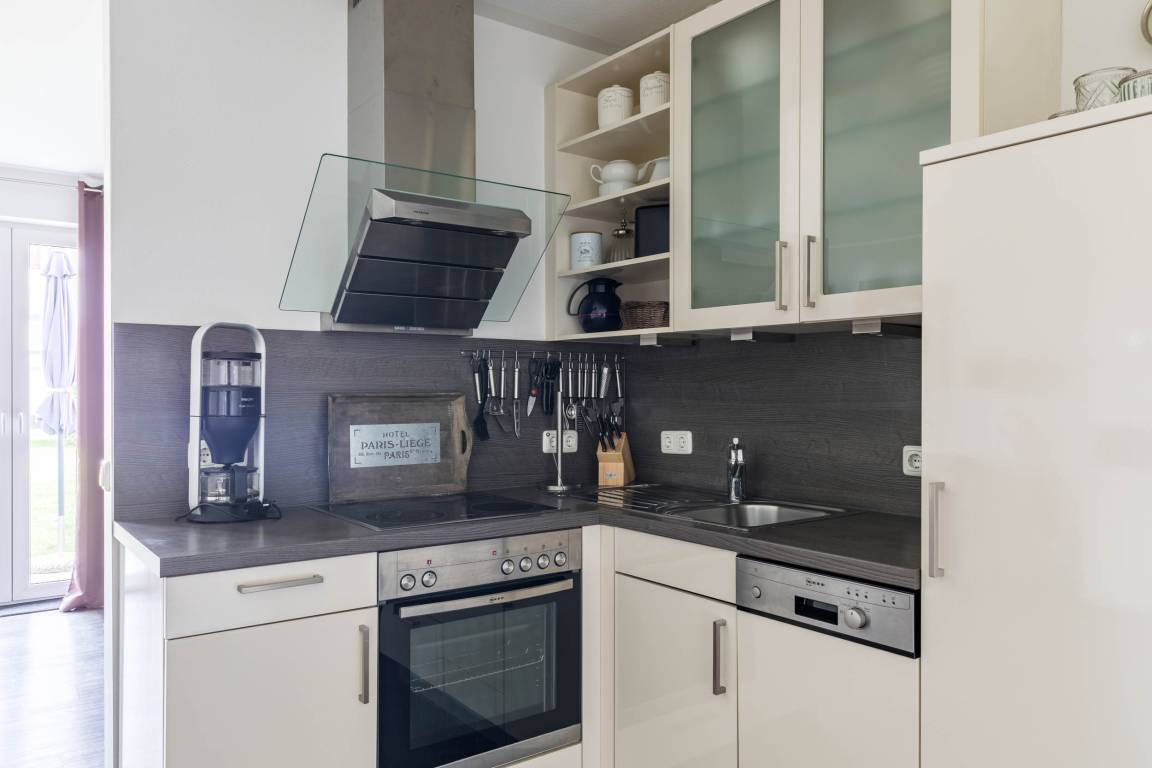 Zu der gut ausgestatteten Küchenzeile mit Cerankochfeld, Backofen, Spülmaschine, Kühlschrank mit Gefrierfach, Toaster sowie Kaffee- und Espressomaschine gehört ein Essbereich für 4 Gäste.