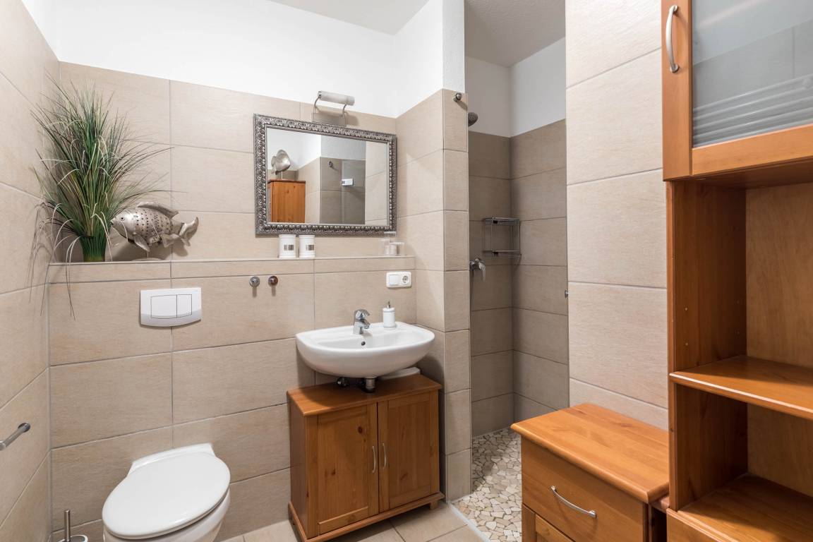 Das moderne Badezimmer bietet eine ebenerdige Dusche, WC und Föhn.
