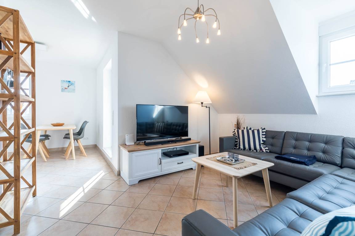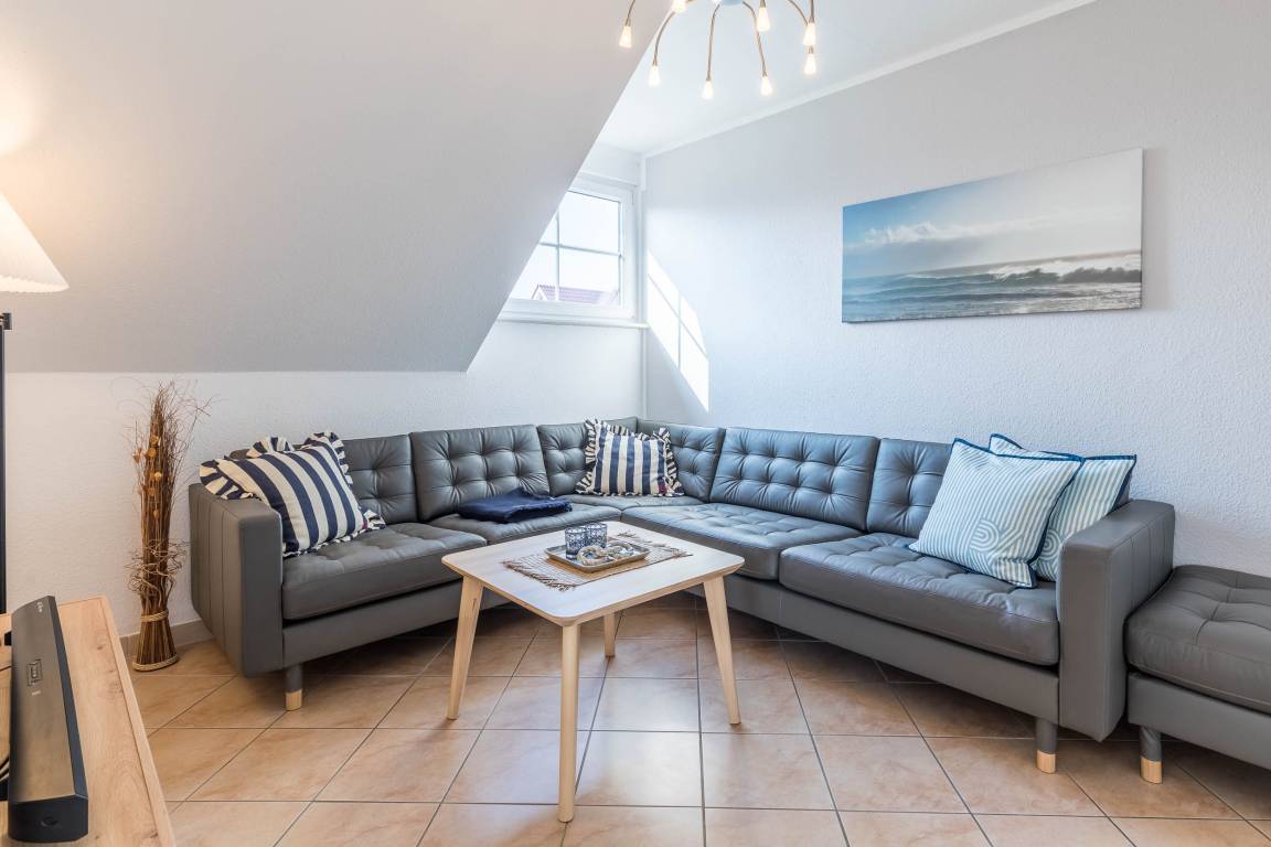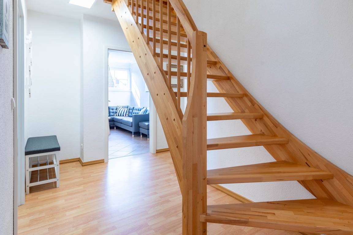 Das 1. Obergeschoss und das Dachgeschoss bieten Platz für bis zu 4 Erwachsene und 1 Kind auf 65qm. Hier befindet sich ein gemütlicher Wohnbereich mit Sofalandschaft, Flatscreen-SAT-TV und Musikanlage. Das Schlafzimmer verfügt über ein Doppelbett und im Dachgeschoss gibt es ein Gästezimmer zwei Einzelbetten sowie einem separaten Ausziehbett und eigenem Flatscreen-TV. Auch hier ist ausreichend Stauraum für Kleidung vorhanden. Das zweite Badezimmer verfügt über eine Dusche, WC und Waschmaschine. Im Dachgeschoss steht außerdem eine Sauna gegen Gebühr zur Verfügung.