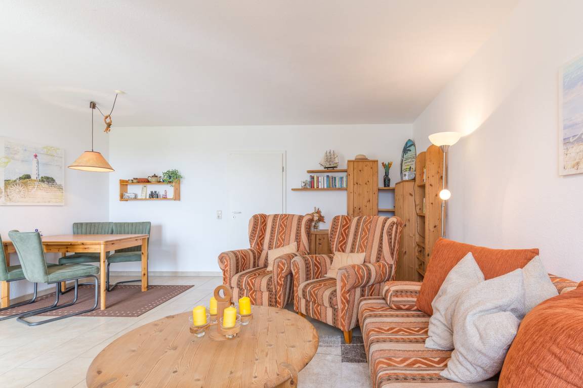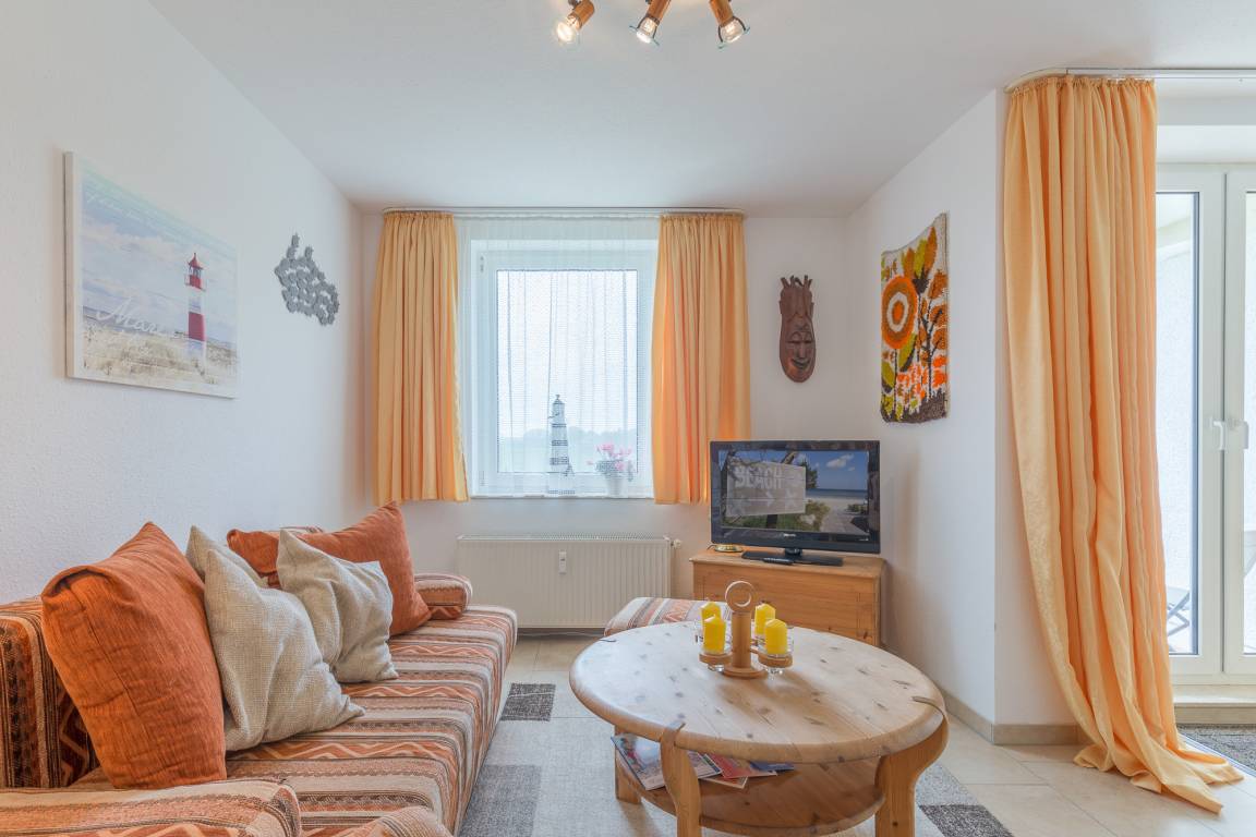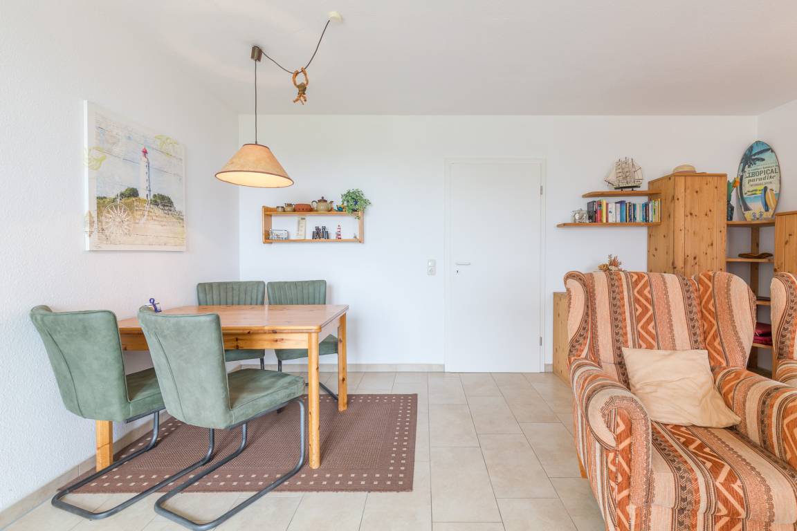 Die helle 2-Zimmer-Ferienwohnung, bietet auf 50 m² Platz für bis zu 4 Personen. Der kleine Balkon im 1. Obergeschoß ist in süd-östlicher Richtung und bietet Platz für einen sonnigen Abend. Die Wohnung liegt ca. 550 m entfernt vom Strand in der Ferienanlage Sünnslag (niederdeutsch für Sonnenlage) und ist zentral und ruhig gelegen.