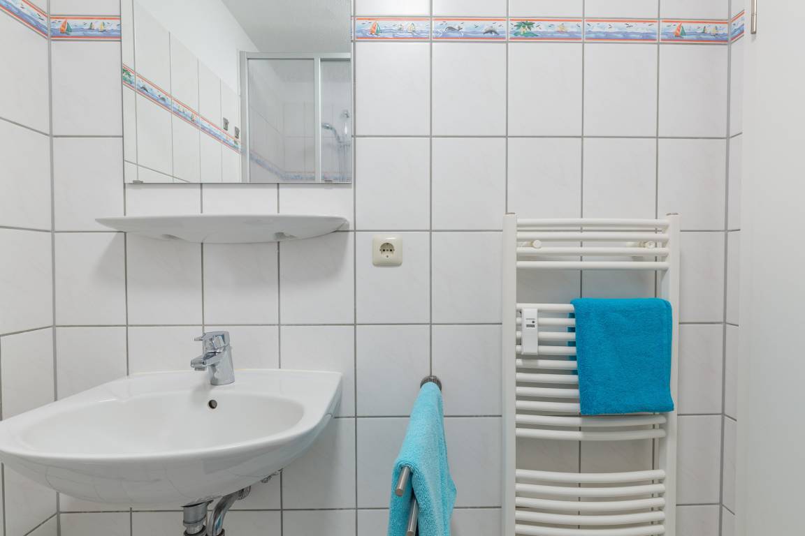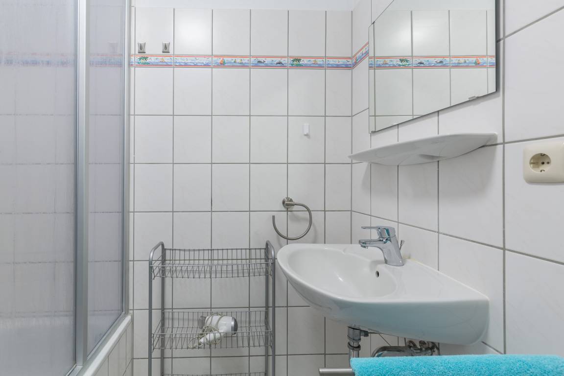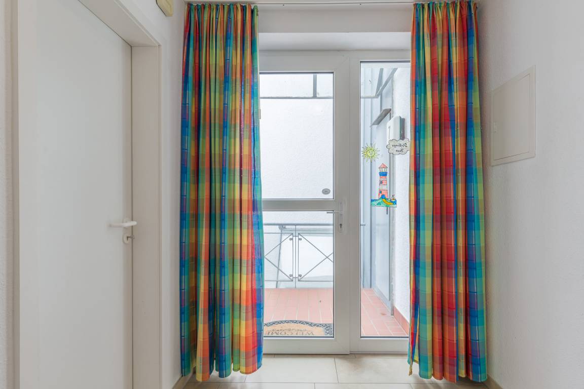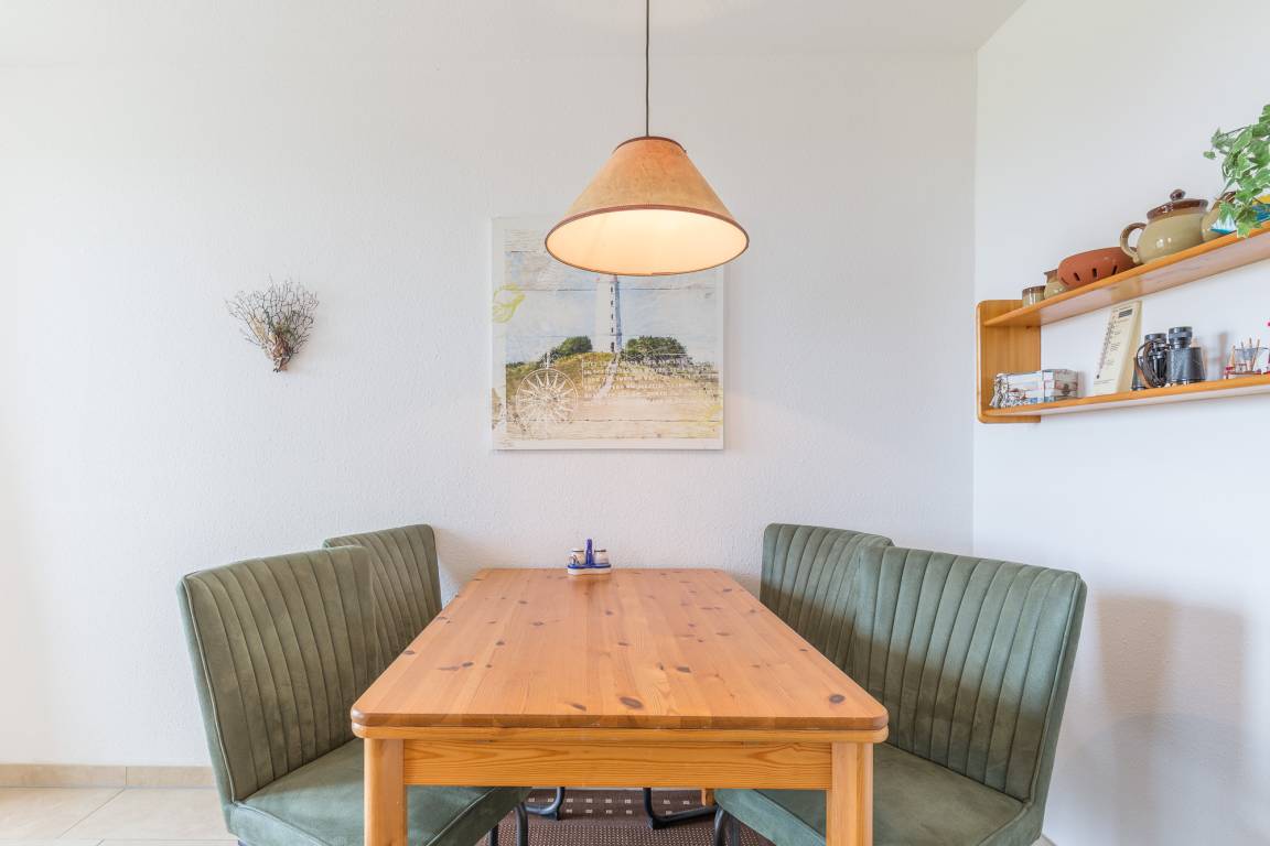 Die helle 2-Zimmer-Ferienwohnung, bietet auf 50 m² Platz für bis zu 4 Personen. Der kleine Balkon im 1. Obergeschoß ist in süd-östlicher Richtung und bietet Platz für einen sonnigen Abend. Die Wohnung liegt ca. 550 m entfernt vom Strand in der Ferienanlage Sünnslag (niederdeutsch für Sonnenlage) und ist zentral und ruhig gelegen.