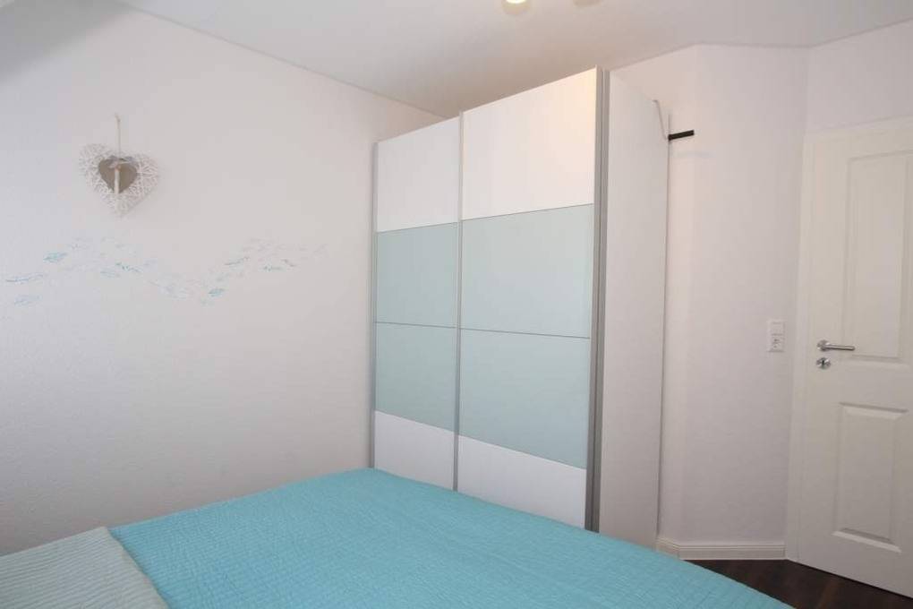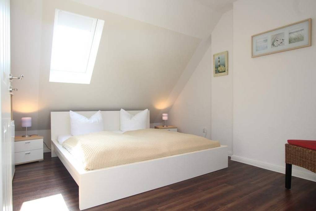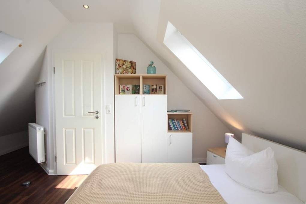 Auch in diesem Schlafzimmer sorgt ein Doppelbett für erholsamen Schlaf. Ein Fernseher bietet hier Unterhaltung. Für Ihre Garderobe gibt es ebenfalls kleinere Ablagemöglichkeiten. An den Veluxfenstern befinden sich Rollos zum Abdunkeln.