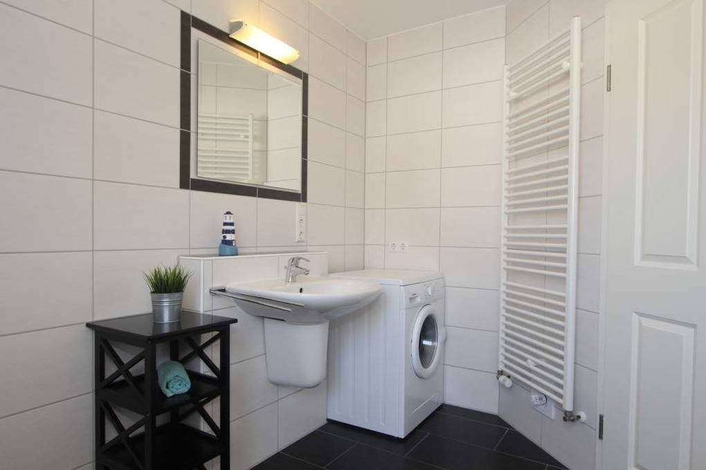 Ebenso befindet sich auf dieser Ebene eines der beiden modernen Bäder. Das Fenster sorgt für zusätzliches Tageslicht und hilft beim Lüften nach einem schönen Bad in der Badewanne oder Sie starten den Tag unter der ebenerdigen Dusche. Dazu ist das Bad selbstverständlich auch mit Waschbecken und WC ausgestattet und auch eine Waschmaschine steht hier für Sie bereit.