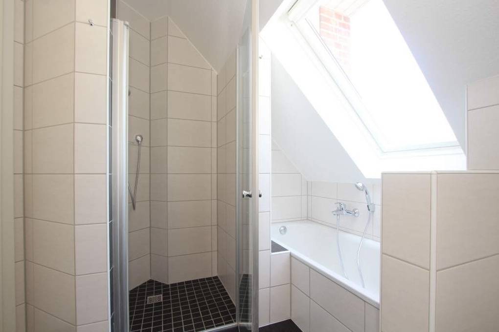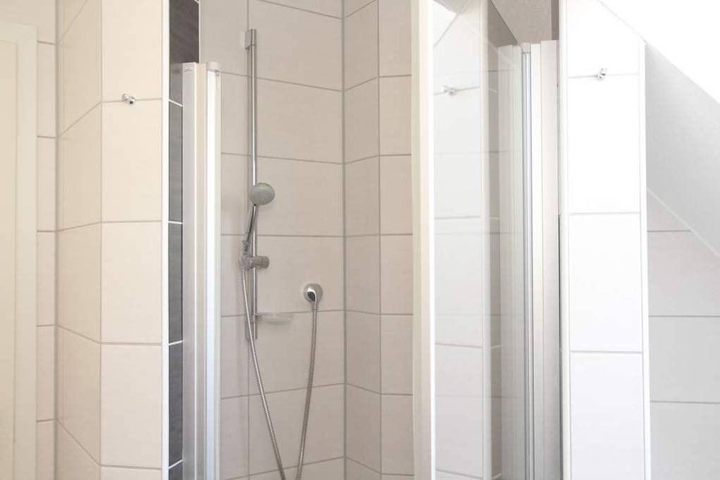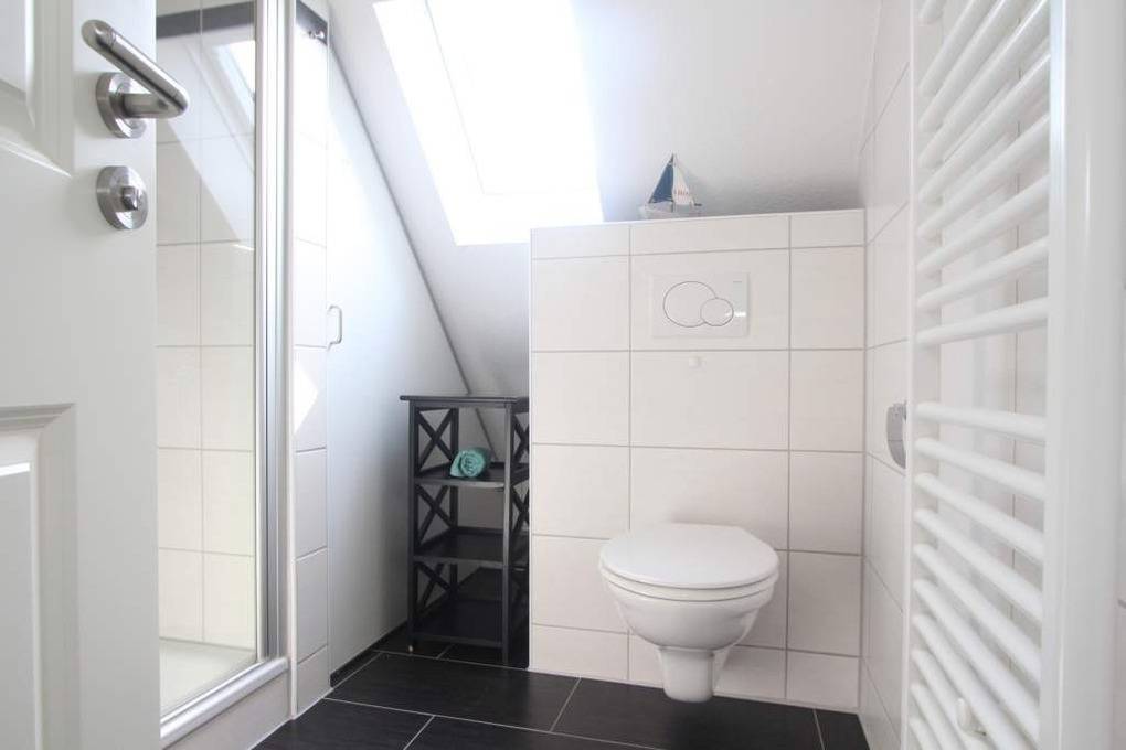Das Bad im DG ist mit Dusche, WC und Waschbecken ausgestattet. Auch hier sorgt ein Fenster für Tageslicht und frische Luft.