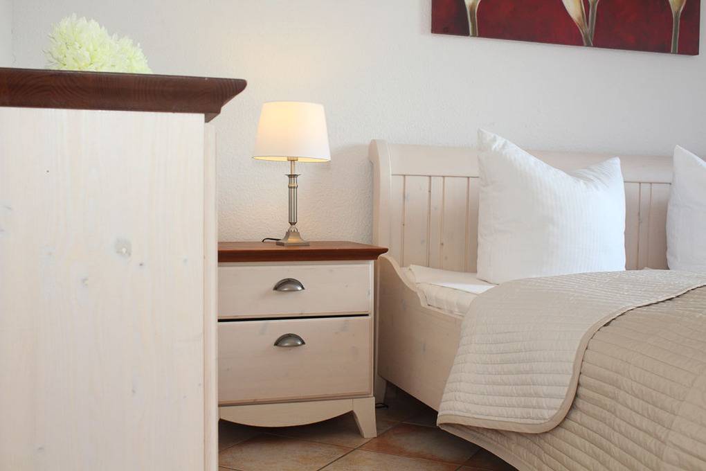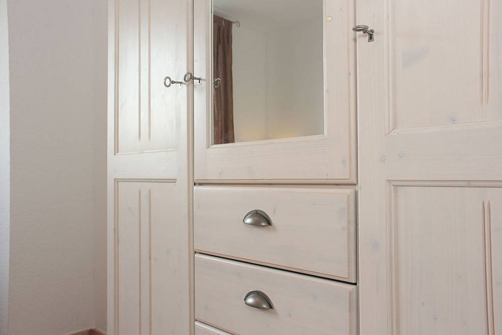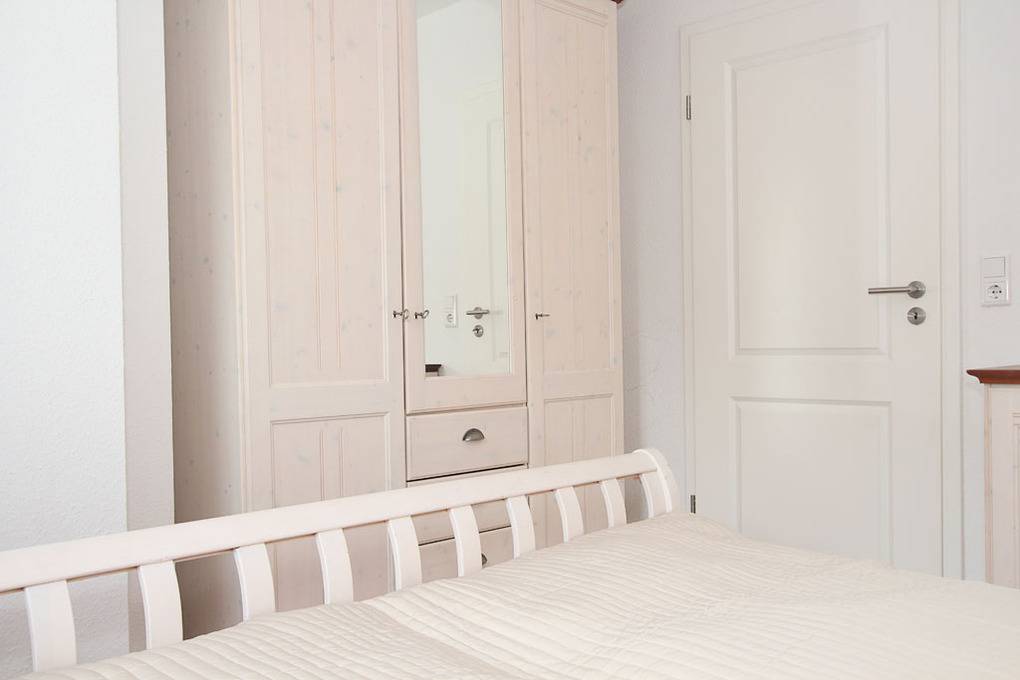 Zur Einrichtung des Schlafzimmers gehört ein bequemes Doppelbett (180x200cm/ Höhe 45cm) sowie ein Kleiderschrank für Ihre Urlaubsgarderobe.