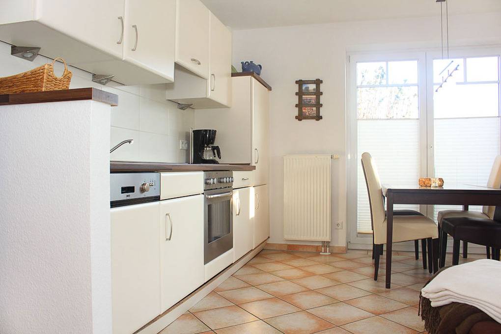 Die zum Wohnbereich offen gestaltete Küchenzeile enthält viele übliche Küchengeräte, um leckere Mahlzeiten zuzubereiten - sei es ein üppiges Urlaubsfrühstück oder ein festliches Abendessen. An der separaten Essecke können Sie mit 4 Personen gemütlich speisen.