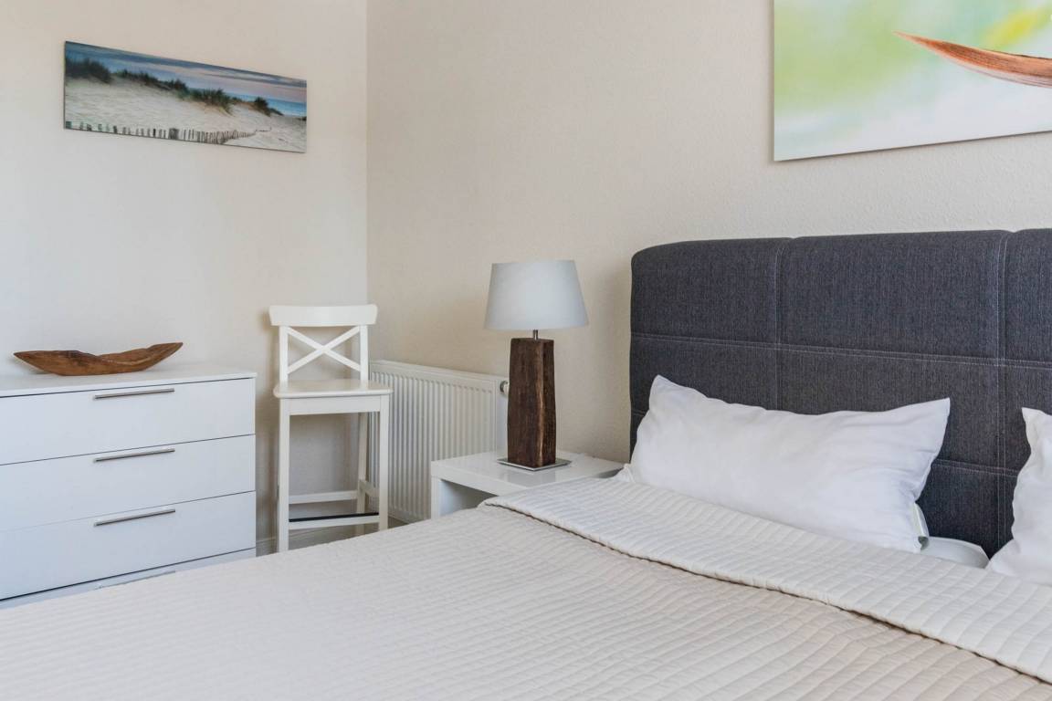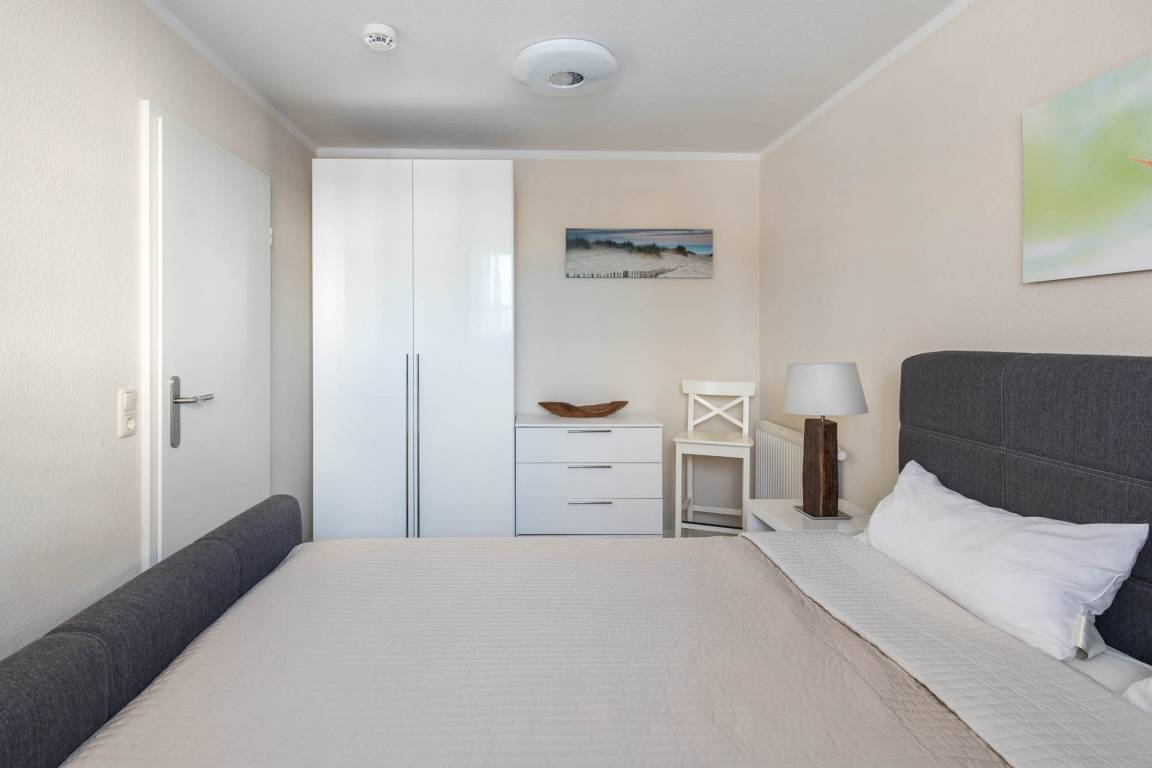 In dem Schlafzimmer befindet sich ein Boxspringbett (180x200m) und ein Kleiderschrank für Ihre Garderobe. An den Fenstern im Schlafbereich sind Verdunklungsplissee angebracht.