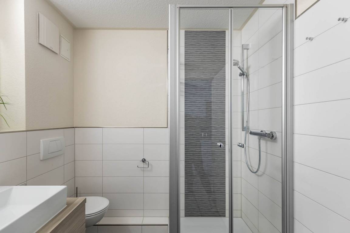 Das Bad ist gefliest und mit einer Dusche und WC ausgestattet.