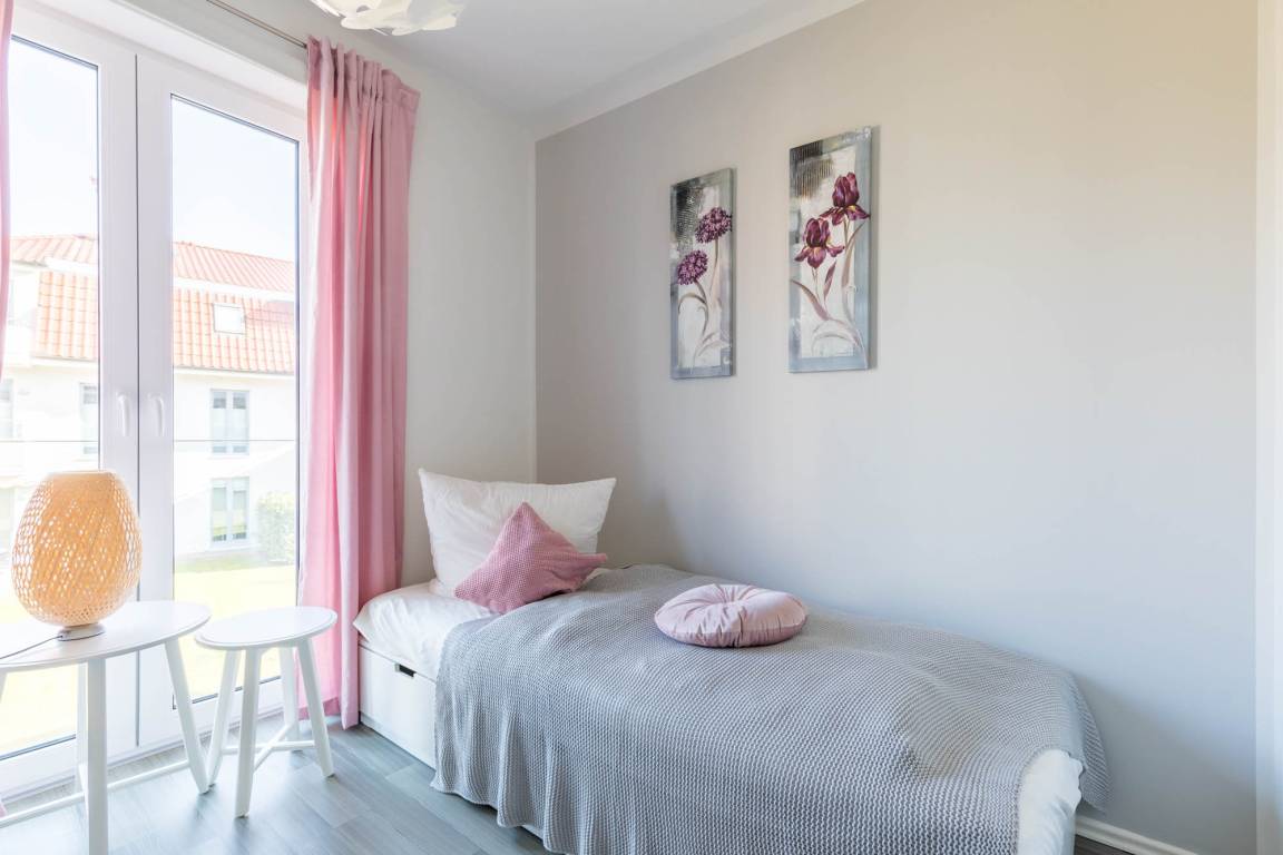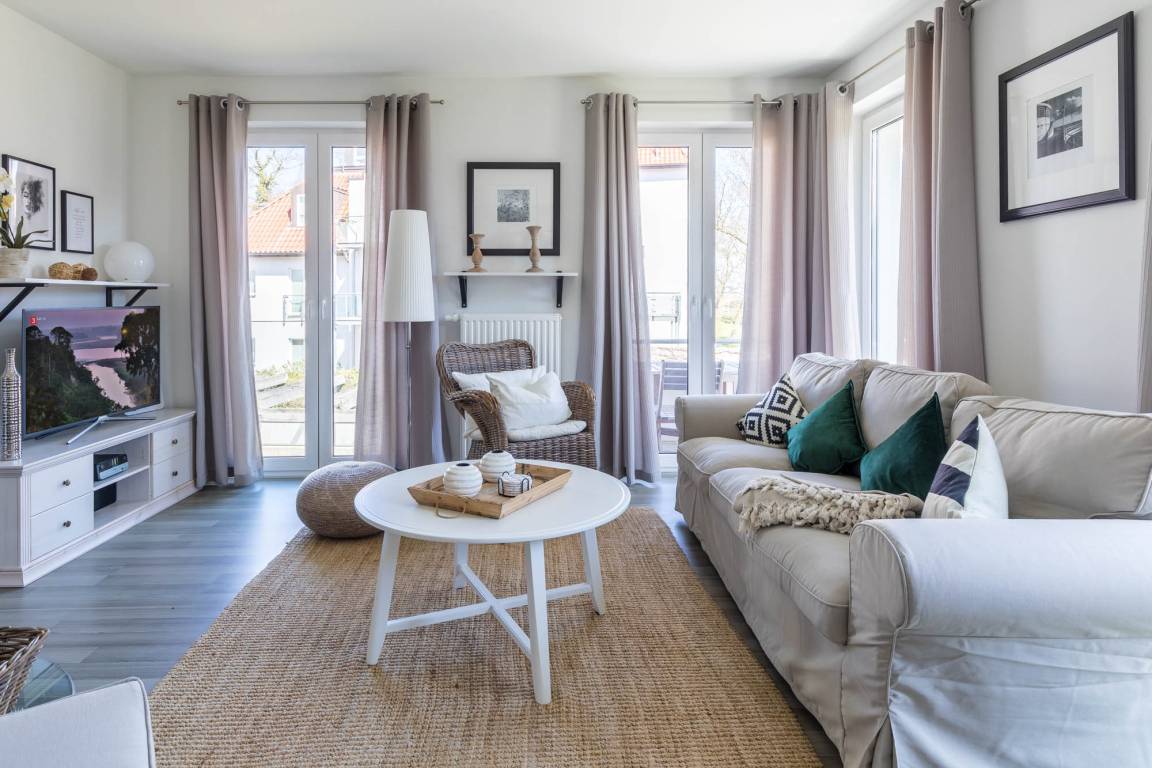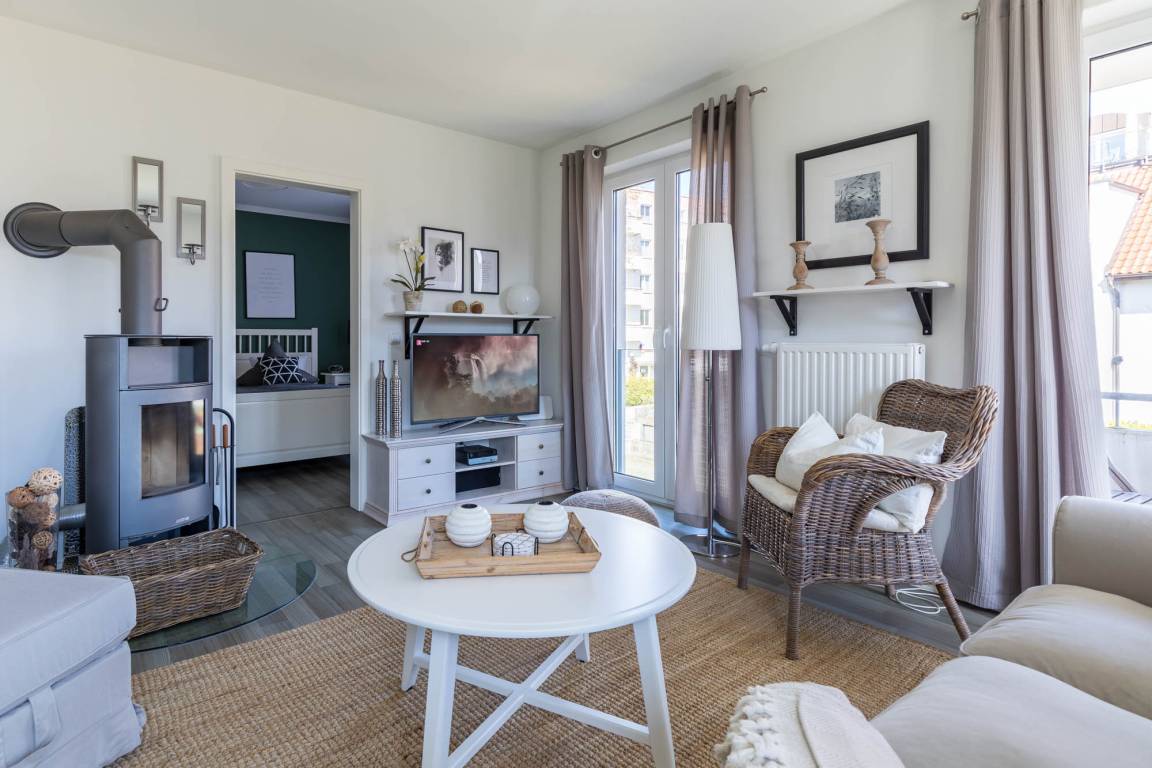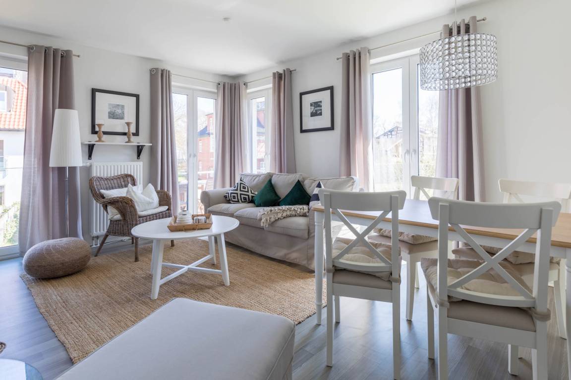 Die strandnahe 3-Zimmer-Wohnung hat eine Größe von 56qm und ist für 4 Gäste in hellem Landhausstil eingerichtet.