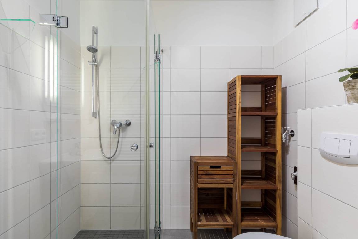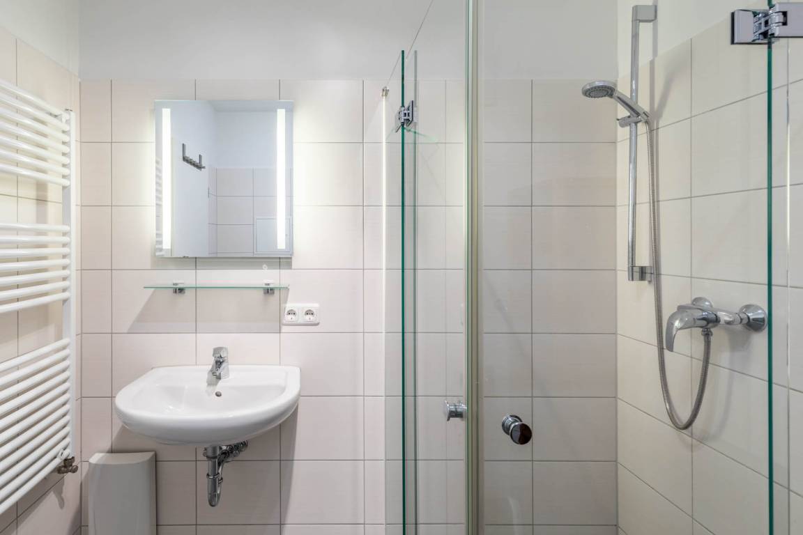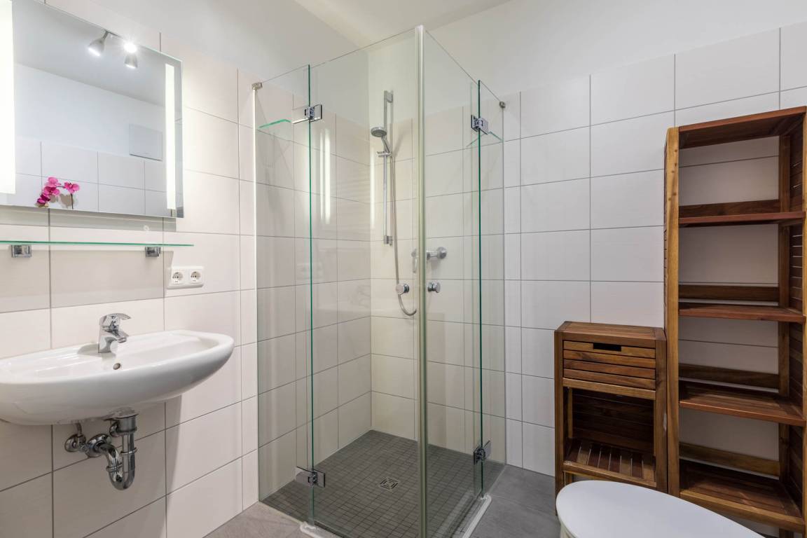 Die Dusche im Bad ist ebenerdig. Es gibt einen Waschtisch und einen Handtuchheizkörper.