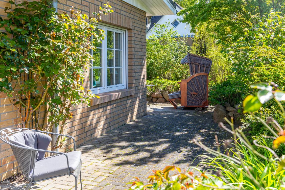 Durch die breite Terrassenschiebetür gelangen Sie direkt auf die großzügige Südost-Terrasse mit Gartenmöbeln und Strandkorb, hier kann man einfach mal einen Moment der Ruhe genießen.