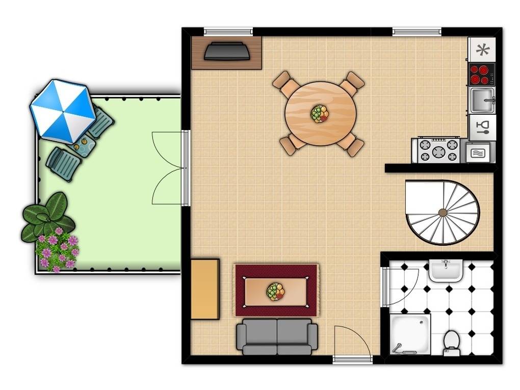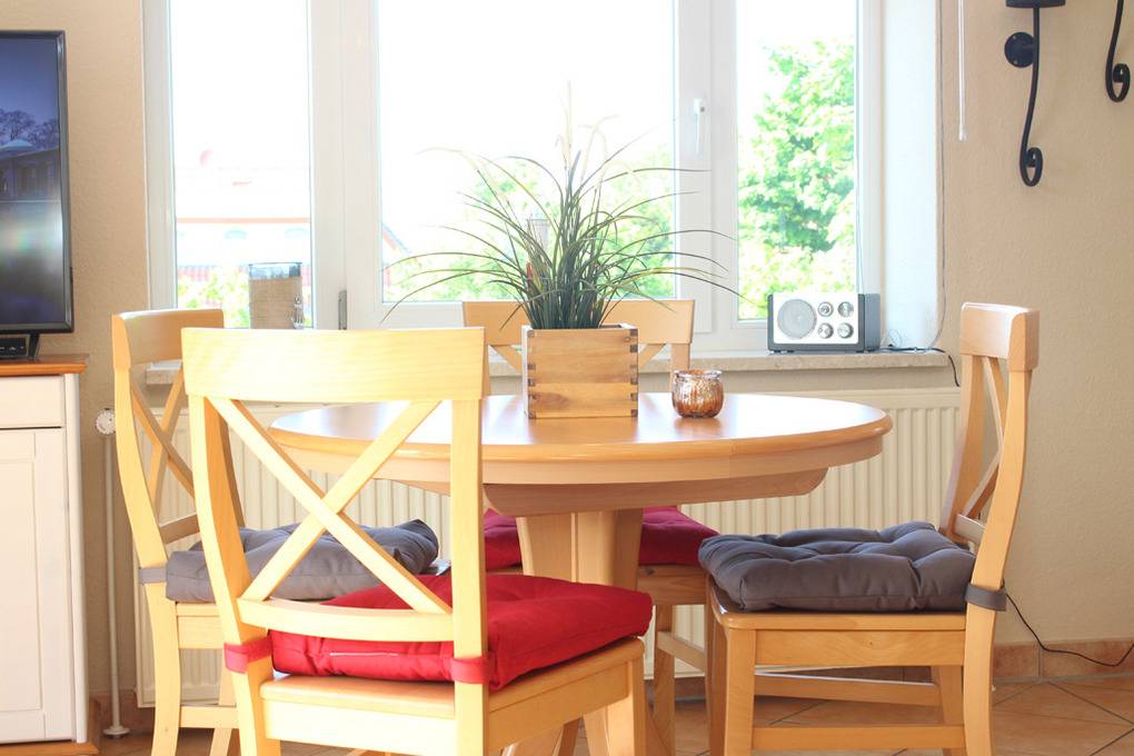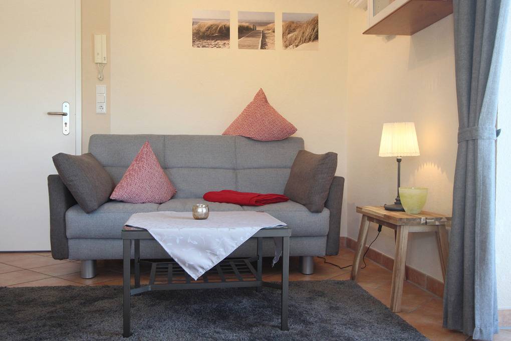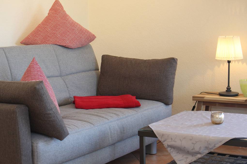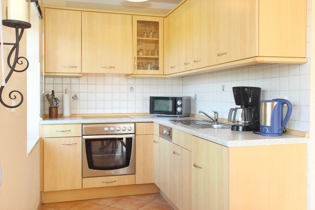Auf der 1. Wohnebene (2.OG) befindet sich der Wohnbereich mit gemütlichem Sofa und Flatscreen-TV (Sat) sowie DVD-Player, an welchem die technisch gut bestückte Küchenecke angrenzt. An der separaten Essecke können Sie gemeinsam Ihre Mahlzeit einnehmen.
