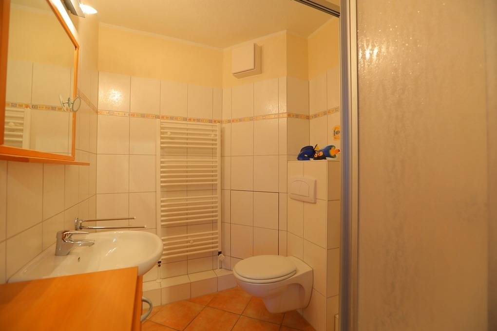 Das Bad finden Sie ebenfalls im unteren Bereich der Wohnung. Dieses ist mit Dusche und WC ausgestattet. Die Handtuchheizung sorgt hier für wohlige Wärme.