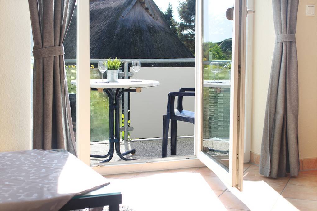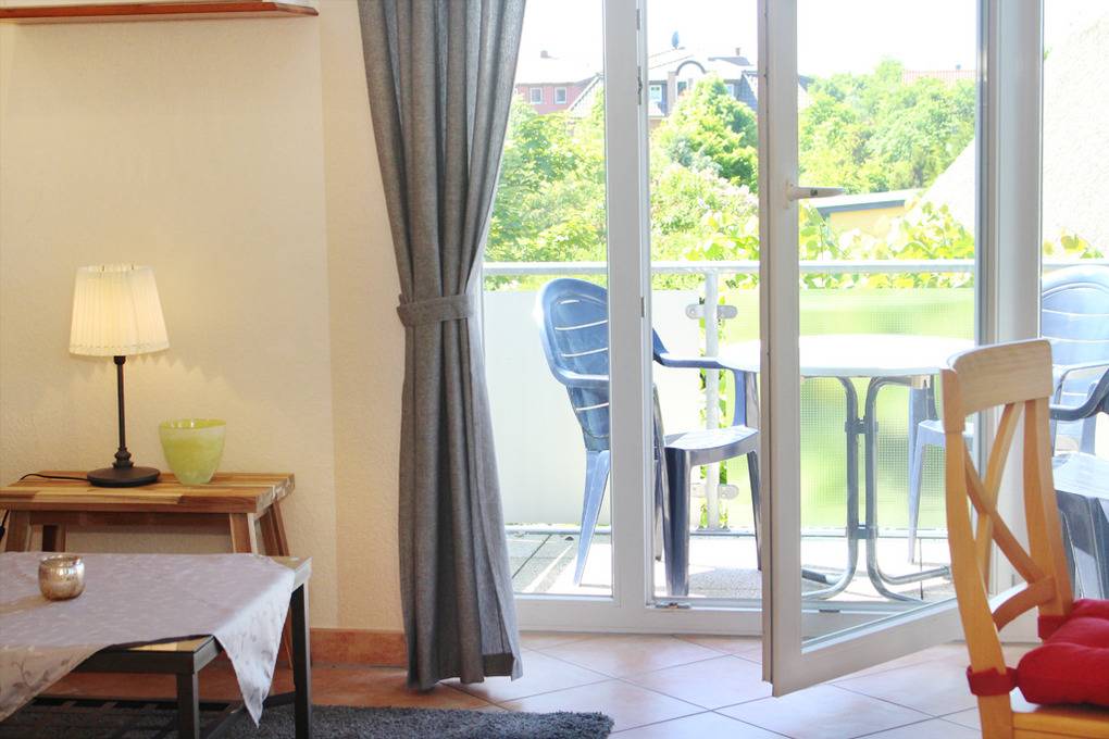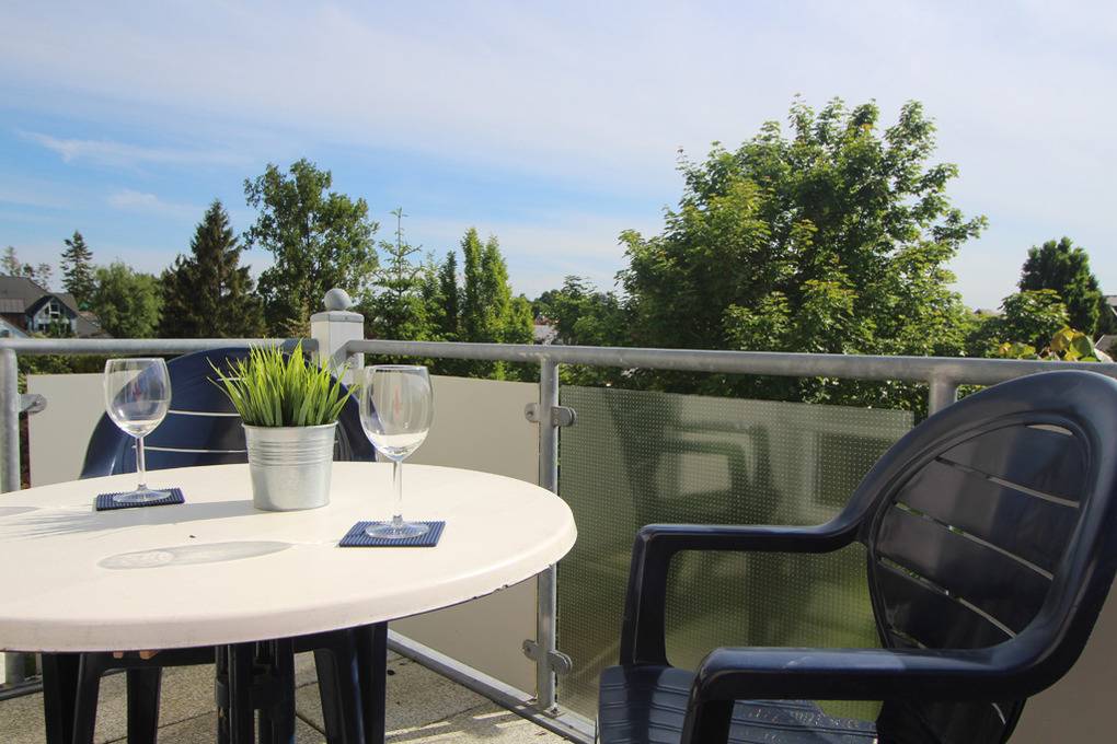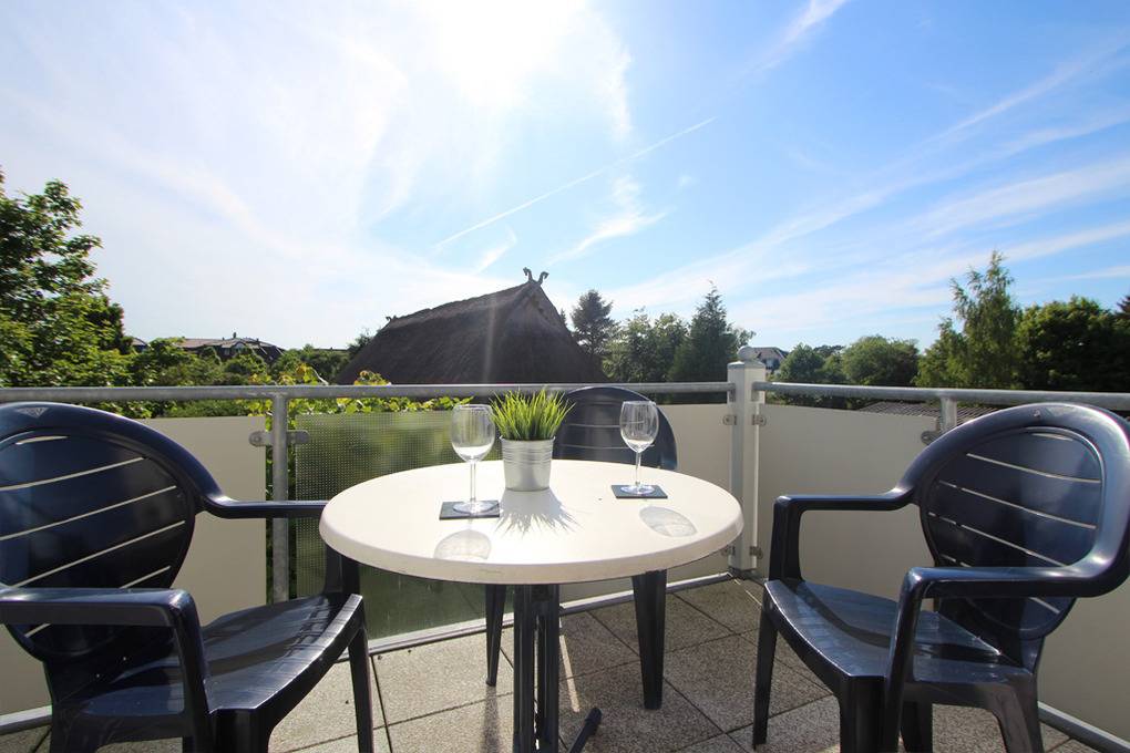 Der möblierte Südwestbalkon, welchen Sie vom Wohnzimmer aus erreichen, komplettiert das komfortable Urlaubsquartier.
