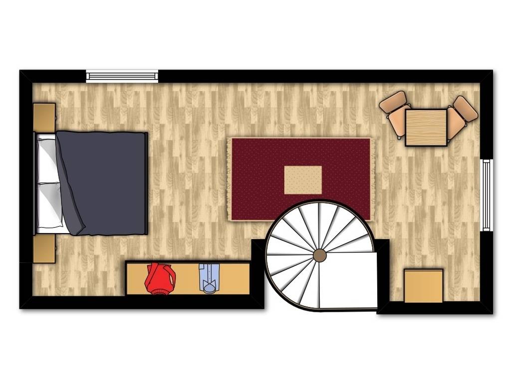 Hier ist eine offene Schlafgalerie mit einem bequemem Doppelbett (180x200cm/ Höhe 51cm), einer kleinen Sitzecke und Ablagemöglichkeiten eingerichtet.