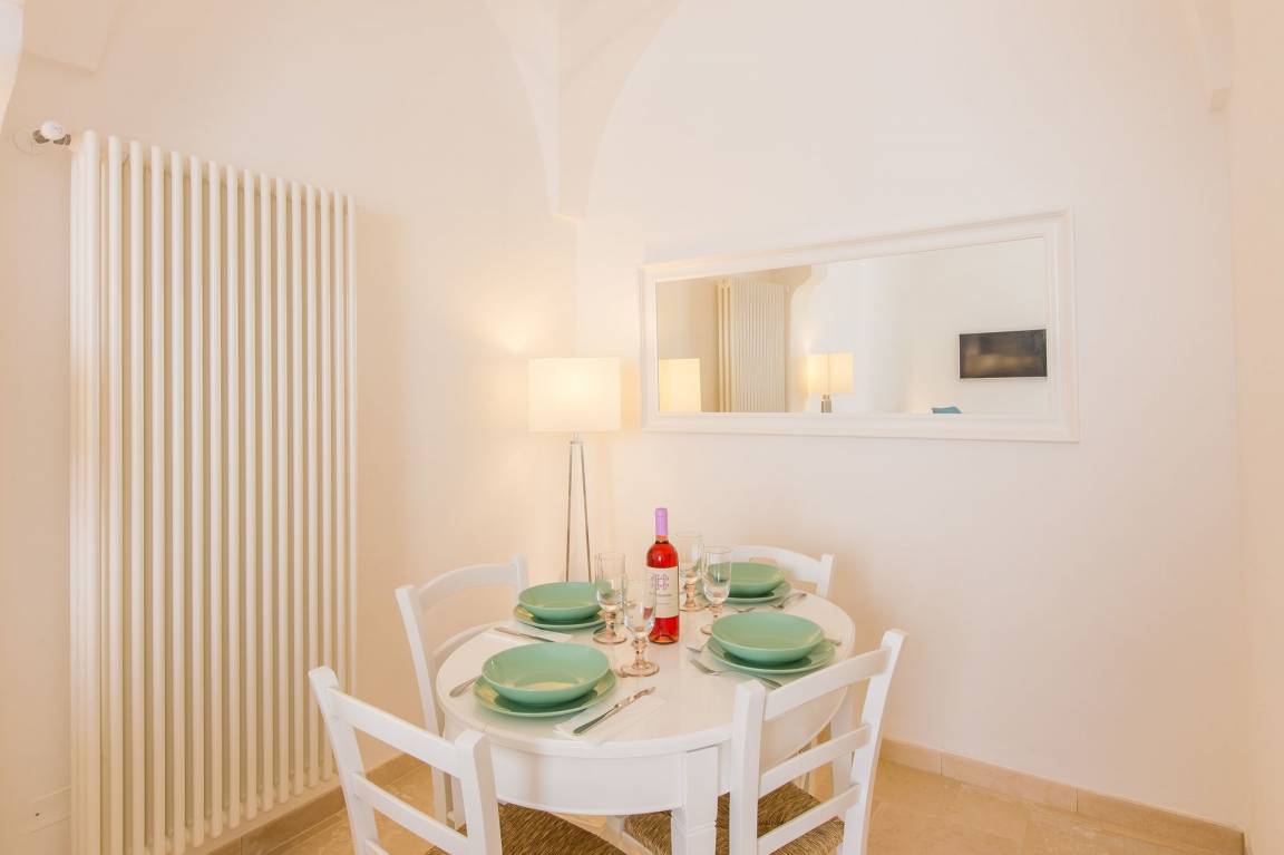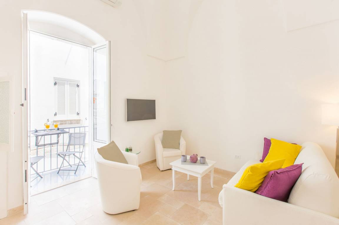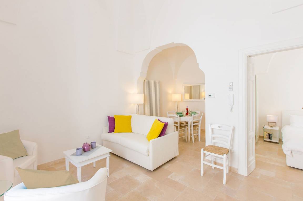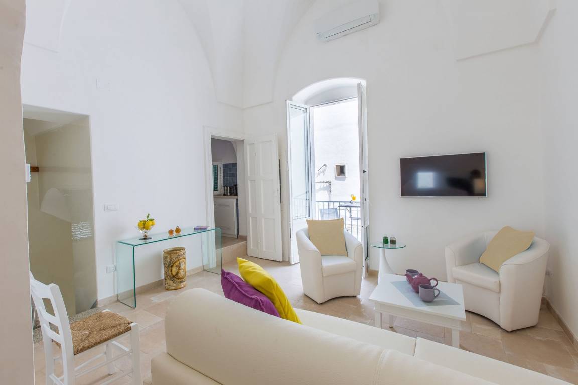 Wohnzimmer: Sofa, zwei Sessel, Esstisch (Personen: 4), WiFi Internet, Klimaanlage, TV, Ausgang auf den Balkon.