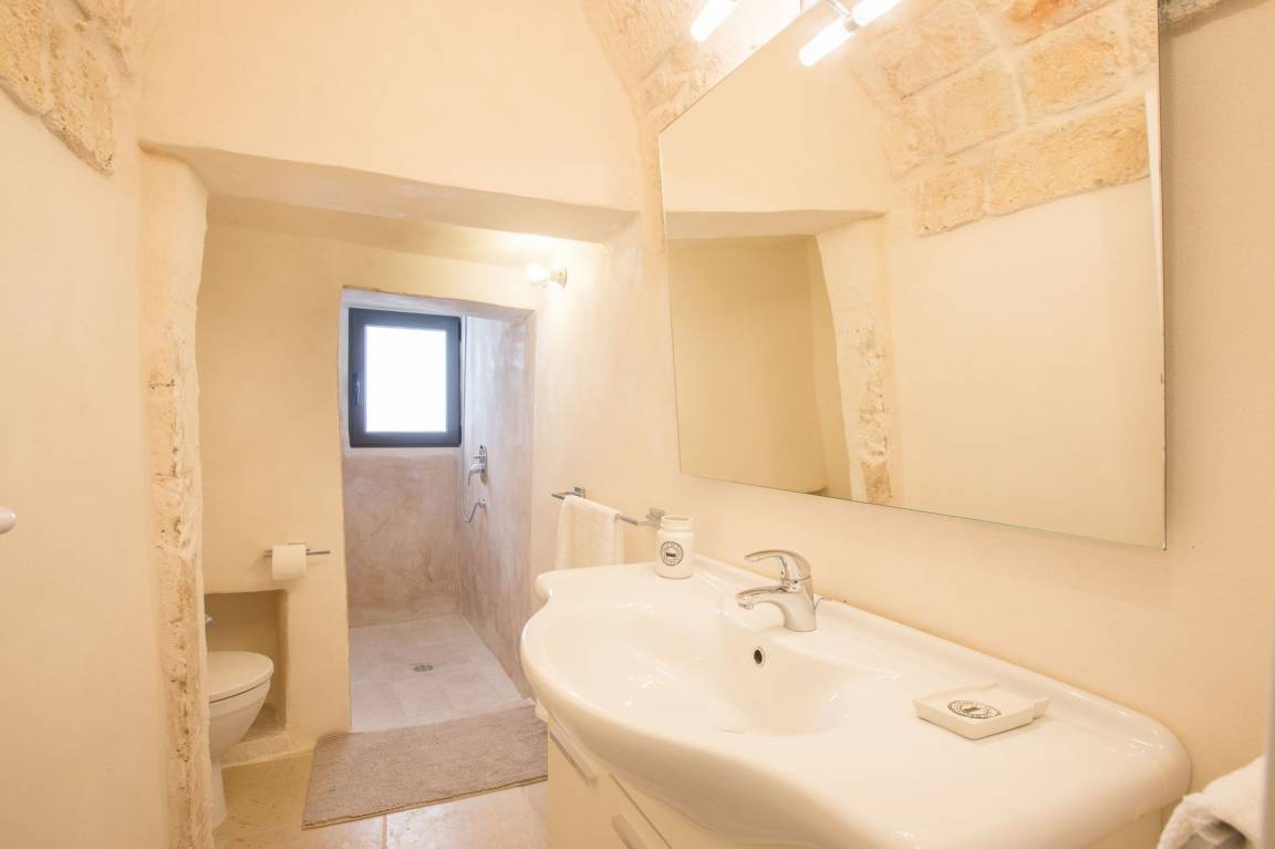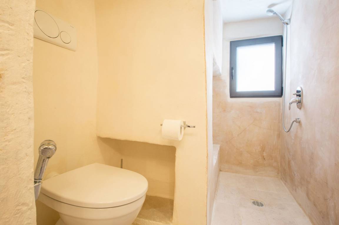 Badezimmer: Waschbecken, WC, Bidet, Dusche, Waschmaschine.