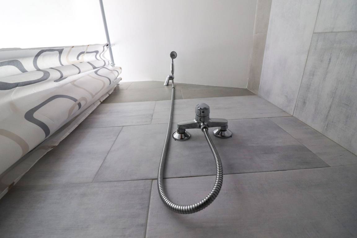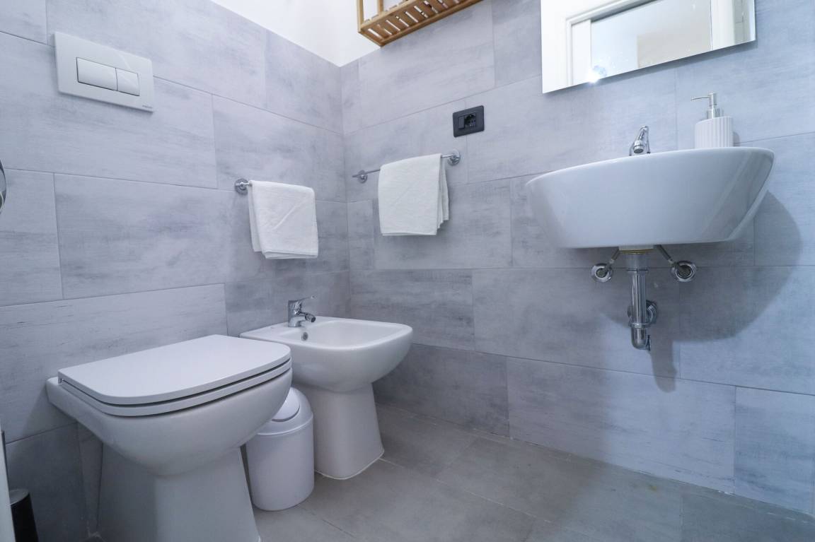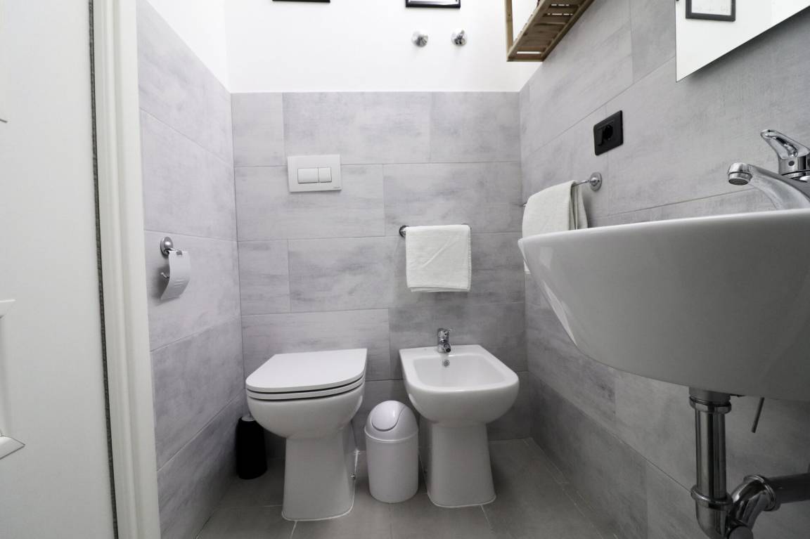 Badezimmer: Waschbecken, WC, Bidet, Dusche, Fön.