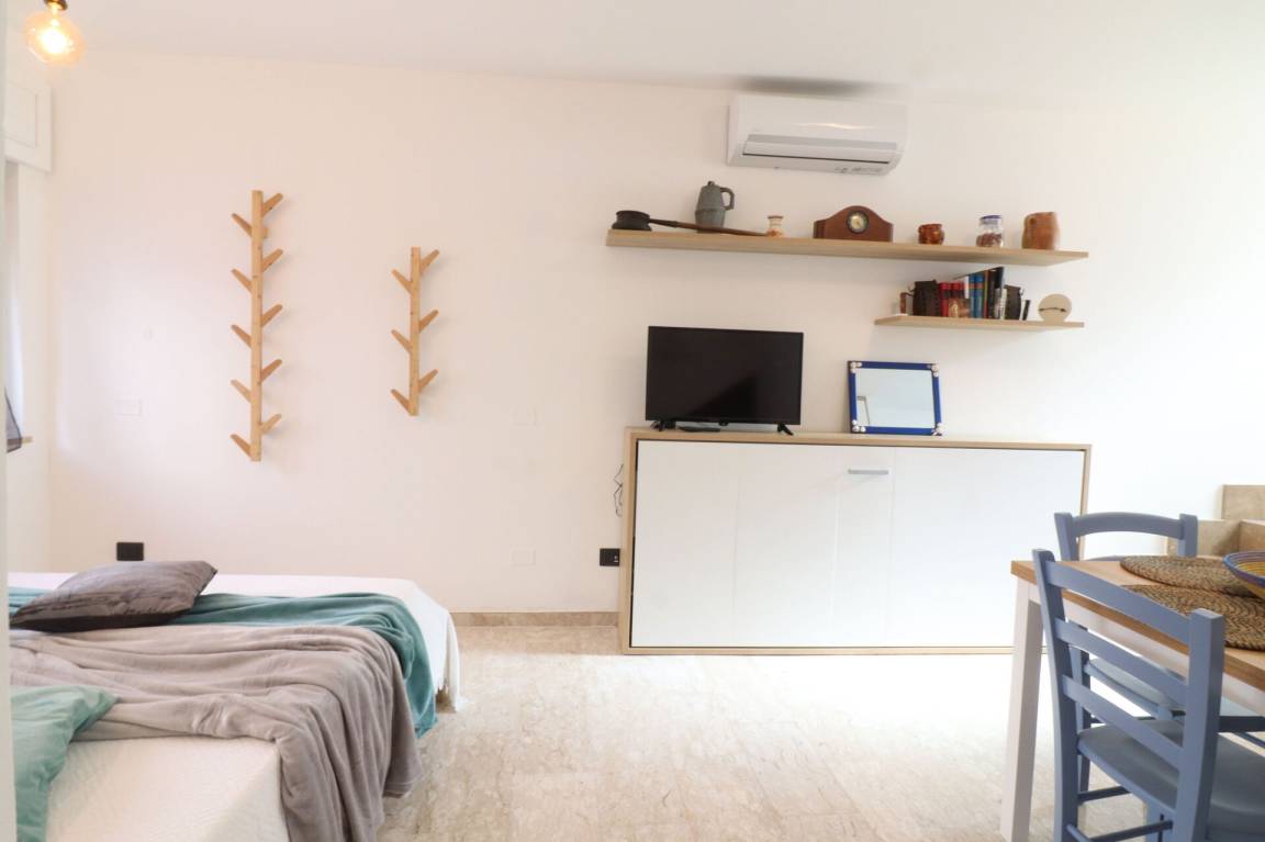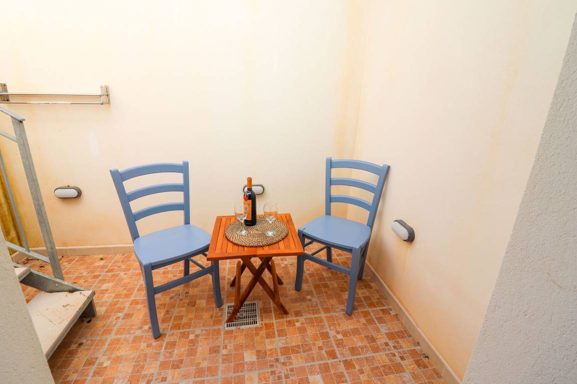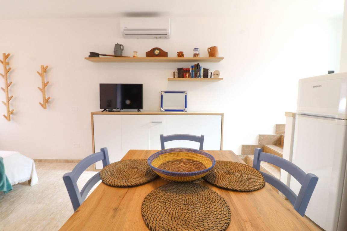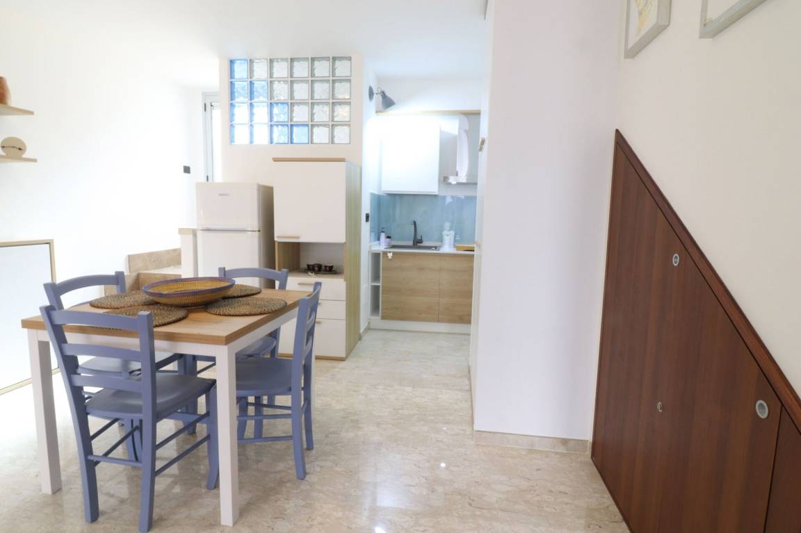 Wohnküche: gut ausgestattete Küche, Esstisch (Personen: 5), Kühlschrank, Tiefkühler, Herd, WiFi Internet, Klimaanlage, TV, Ausgang auf die Veranda.