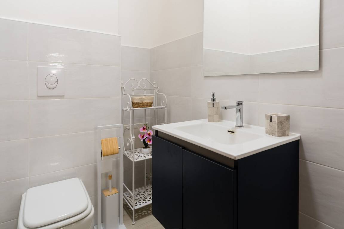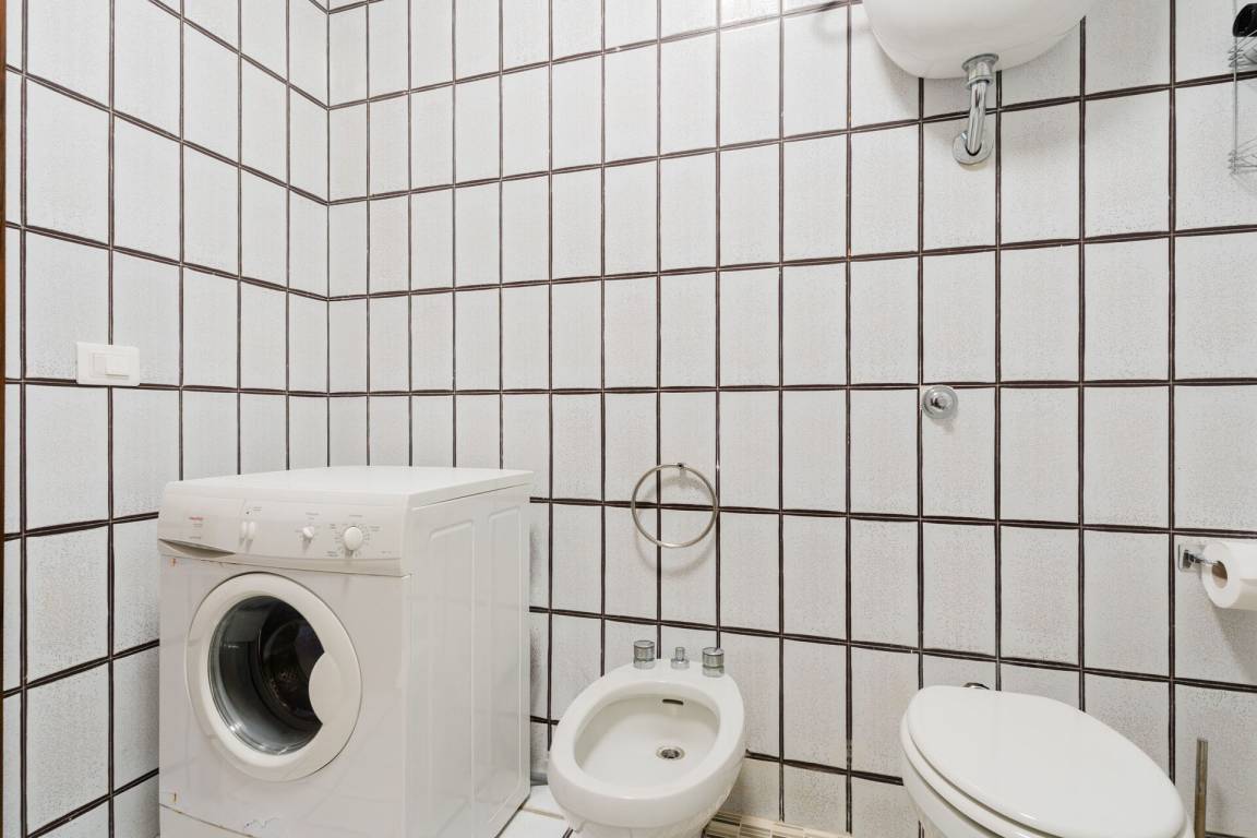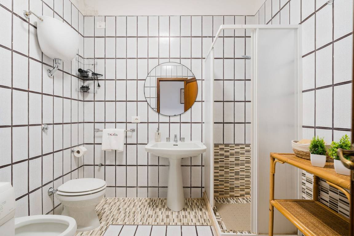 Badezimmer: Waschbecken, WC, Bidet, Dusche, Fön, Waschmaschine.