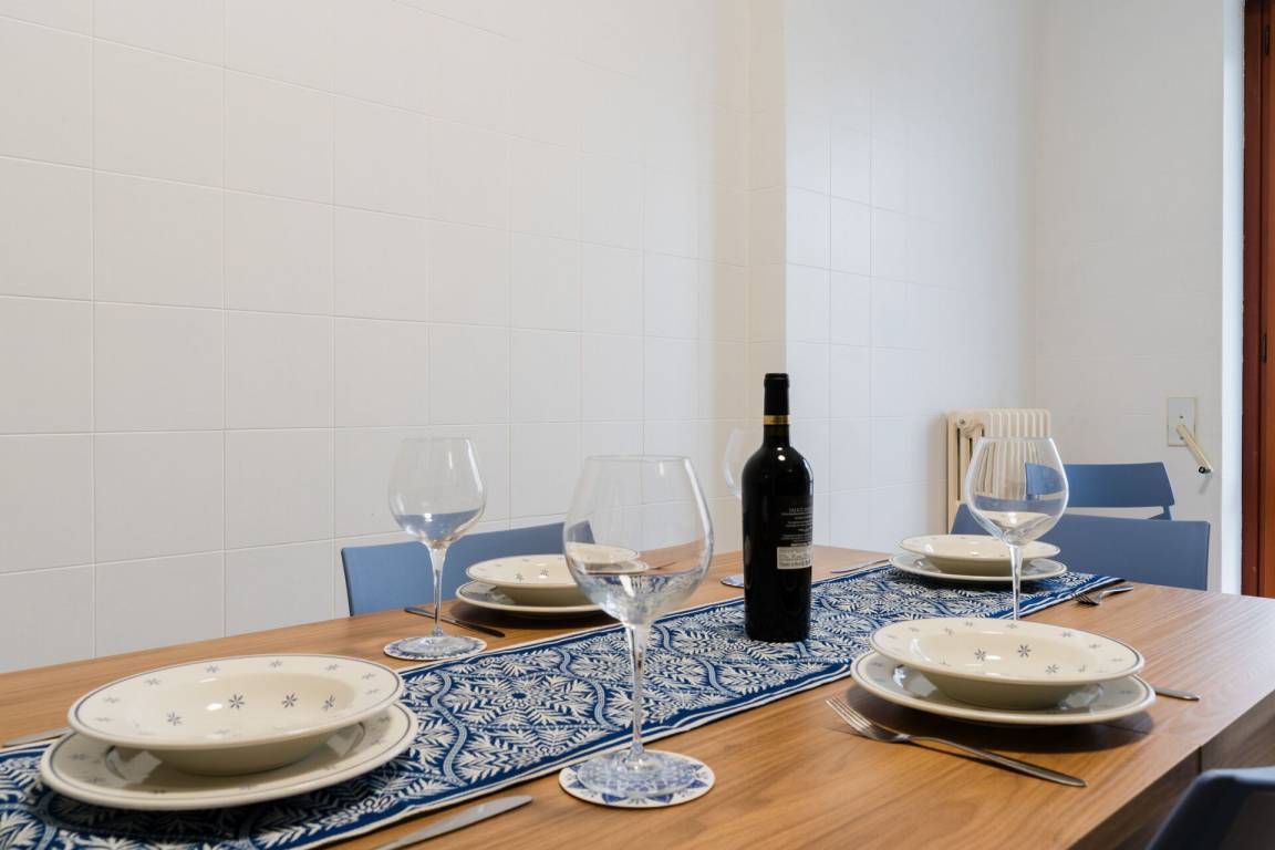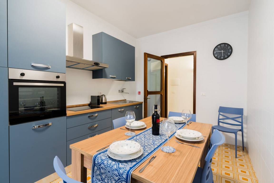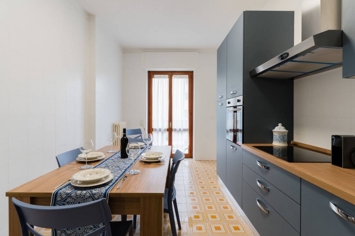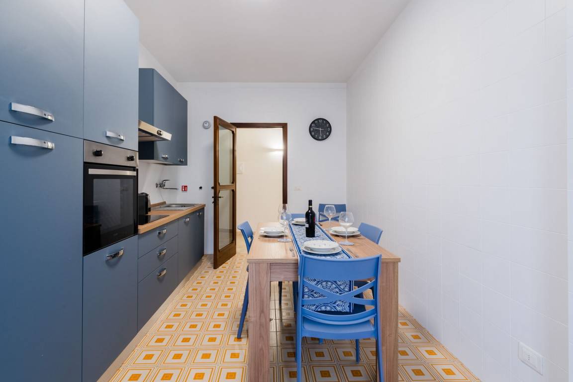 Küche: gut ausgestattete Küche, Esstisch (Personen: 6), Kühlschrank, Tiefkühler, Herd, Ofen, Ausgang auf den Balkon.