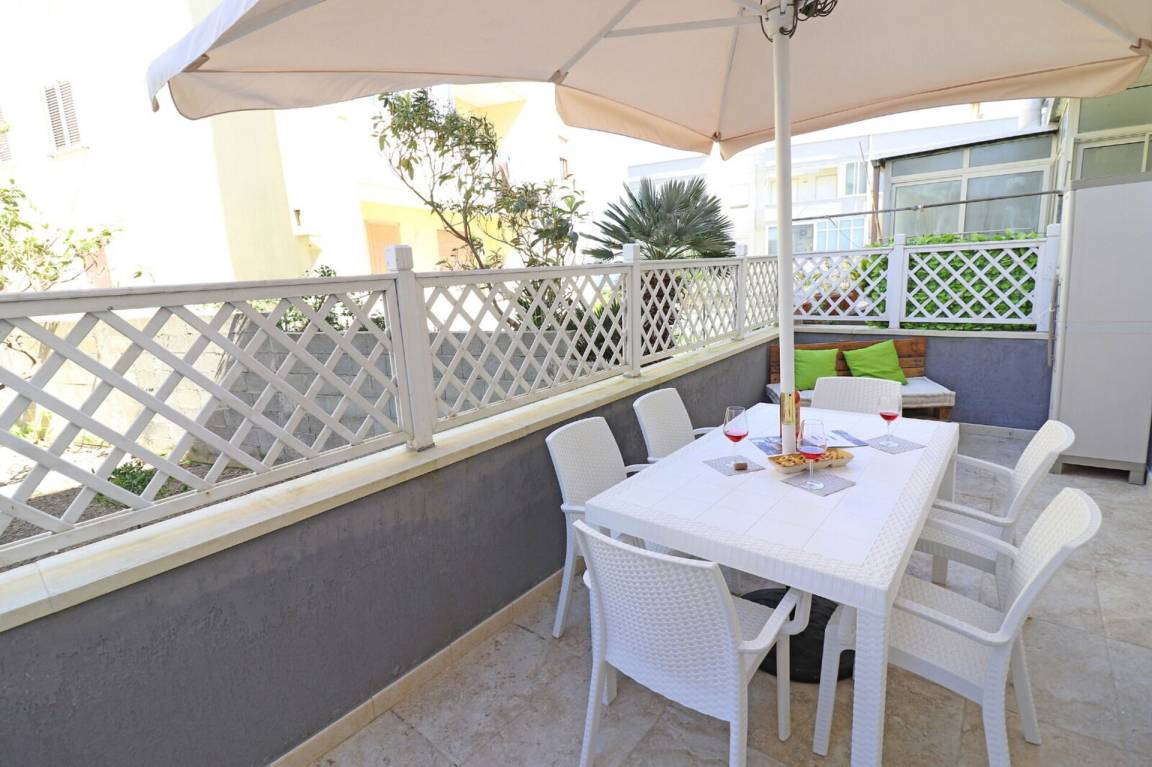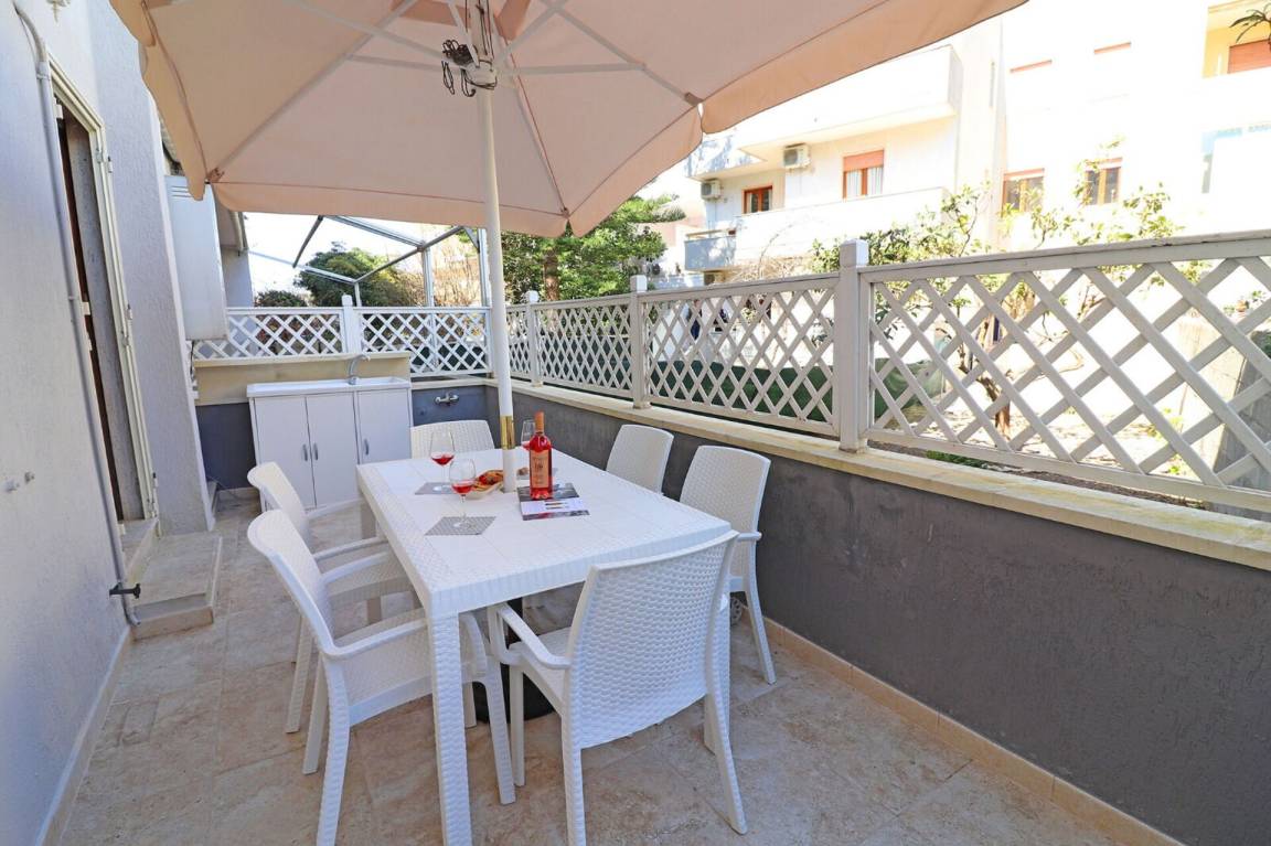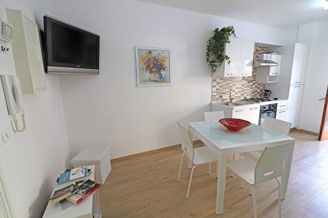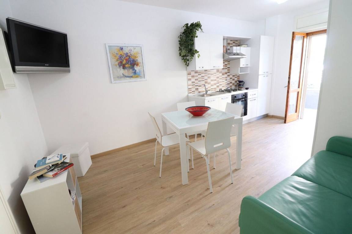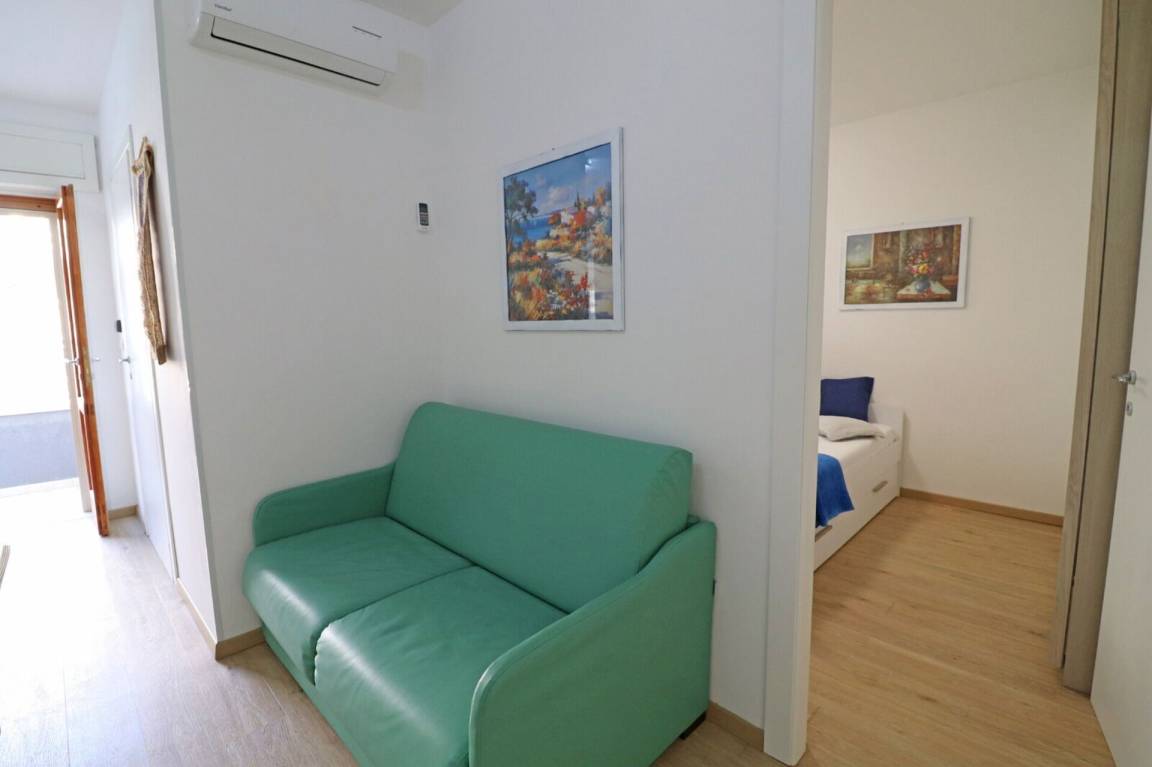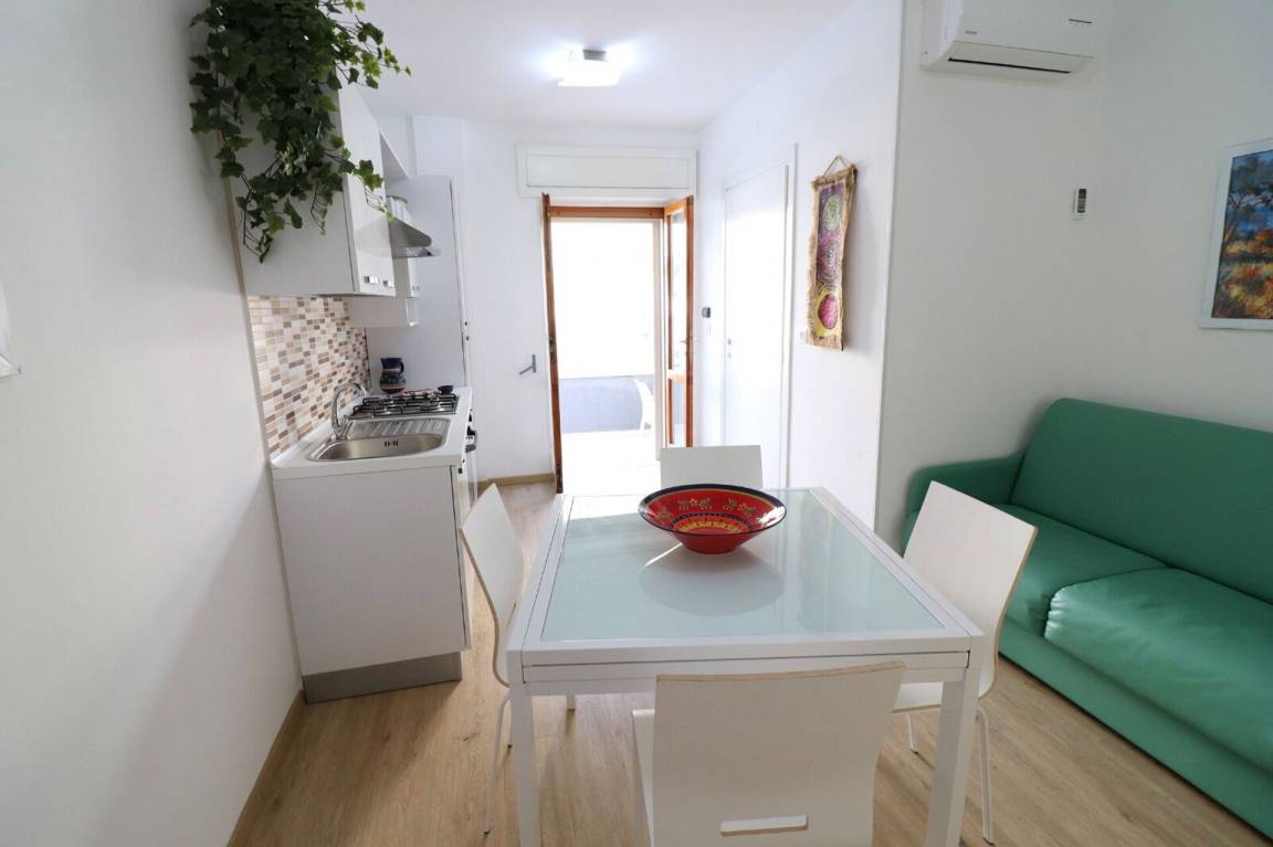 Wohnküche: gut ausgestattete Küche, Esstisch (Personen: 4), Kühlschrank, Tiefkühler, Herd, Ofen, Sofa bed, WiFi Internet, Klimaanlage, TV, Ausgang auf den Garten.