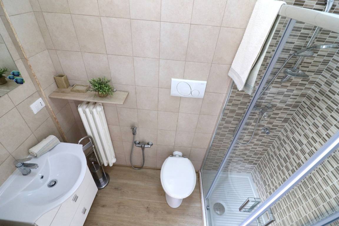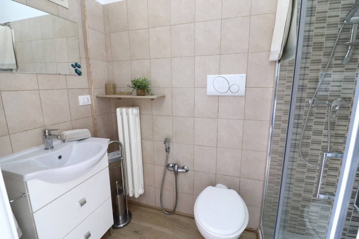 Badezimmer: Waschbecken, WC, Bidet, Dusche.