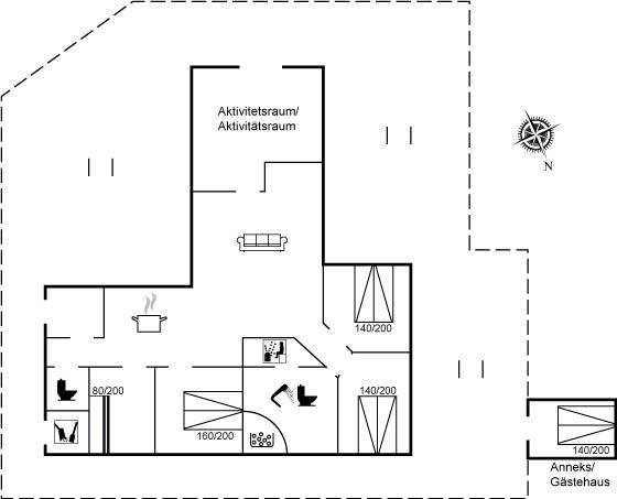 SchlafverhältnisseDie Schlafplätze verteilen sich auf 5 Schlafräume. 8 Schlafplätze in Doppelbetten. 2 Schlafplätze in einem Etagenbett. 2 von diesen Schlafplätzen befinden sich im Gästehaus. Ferner steht ein Kinderbett zur Verfügung.