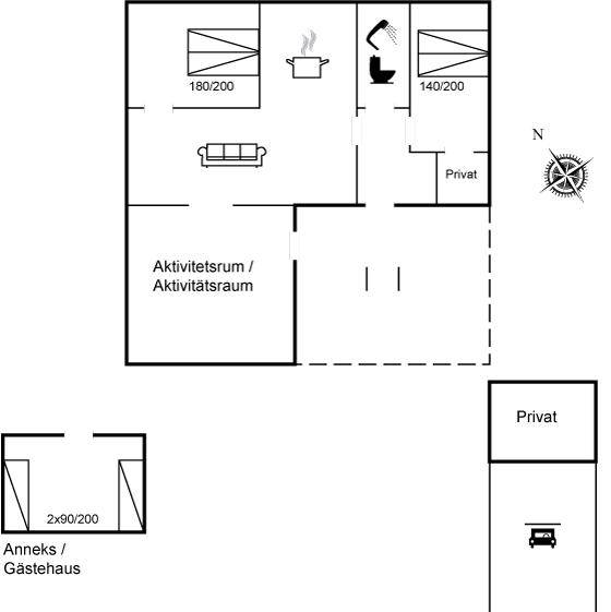 DraußenDie Ferienunterkunft liegt auf einem 756 m² großen Gartengrundstück. Die Entfernung zum Meer beträgt 280 m. Die nächste Einkaufsmöglichkeit liegt 1800 m entfernt. Es steht ein offenes Terrassenareal zur Verfügung. Außendusche. Es steht ein Grill zur Verfügung. Es steht ein Carport zur Verfügung. Parkplatz auf dem Grundstück.