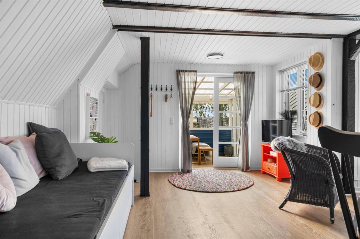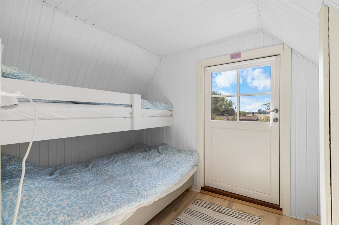 Im Obergeschoss befinden sich die beiden Schlafzimmer. In einem der Zimmer steht ein Etagenbett mit einem extra breiten unteren Bett, das auch von 2 Personen genutzt werden kann. Von hier hast du außerdem Zugang zum Balkon.