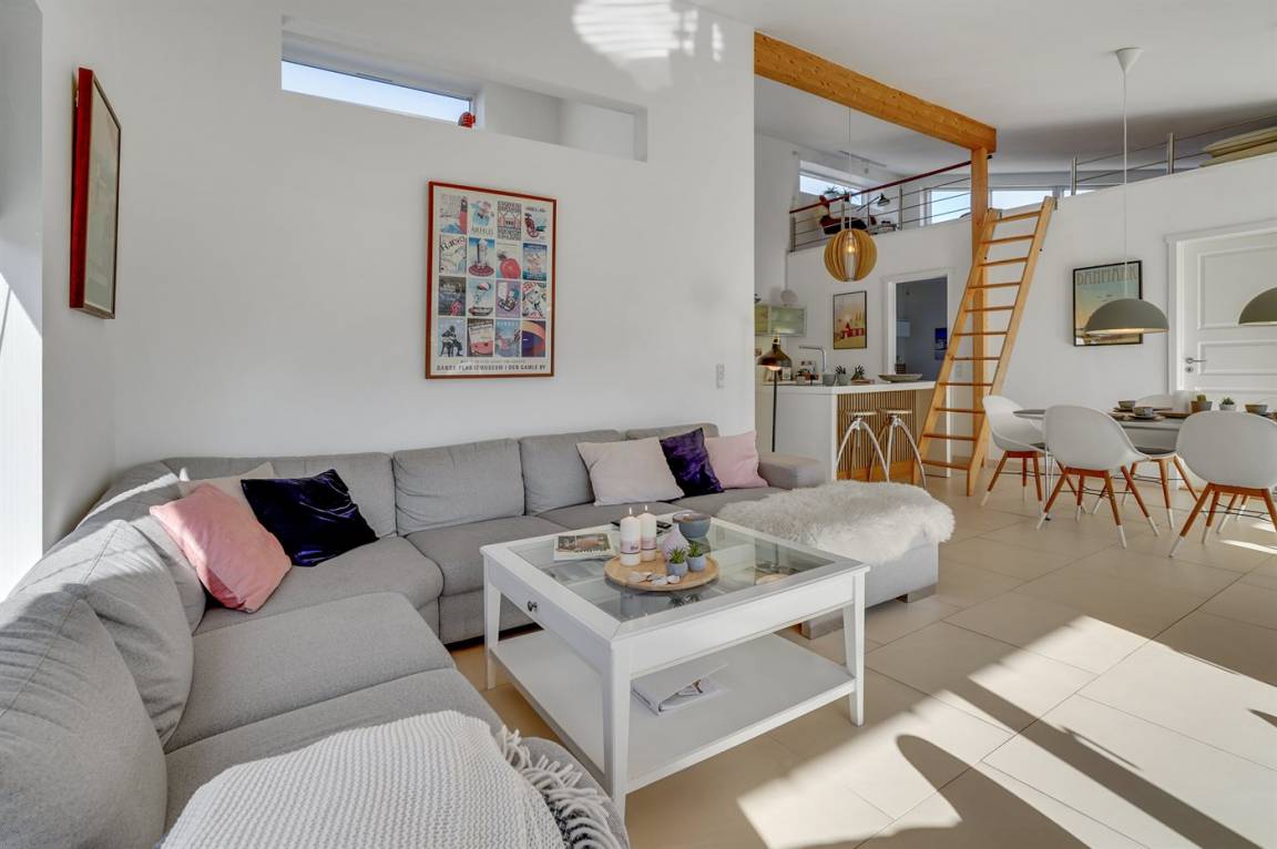 Vom Wohn-/Esszimmer führt eine Leiter in das offene Obergeschoss mit Meeresblick, das als Leseecke mit 2 Chaiselongue-Sessel eingerichtet ist. In dem einen Zimmer gibt es ein ferngesteuertes Oberlichtfenster. Es gibt vom Badezimmer direkten Zutritt zur Außendusche (warm und kalt Wasser), die sich in einer abgeschirmten Ecke der Terrasse befindet.