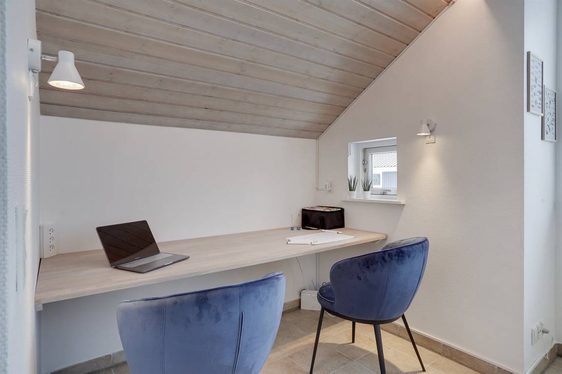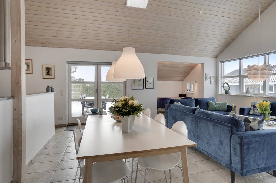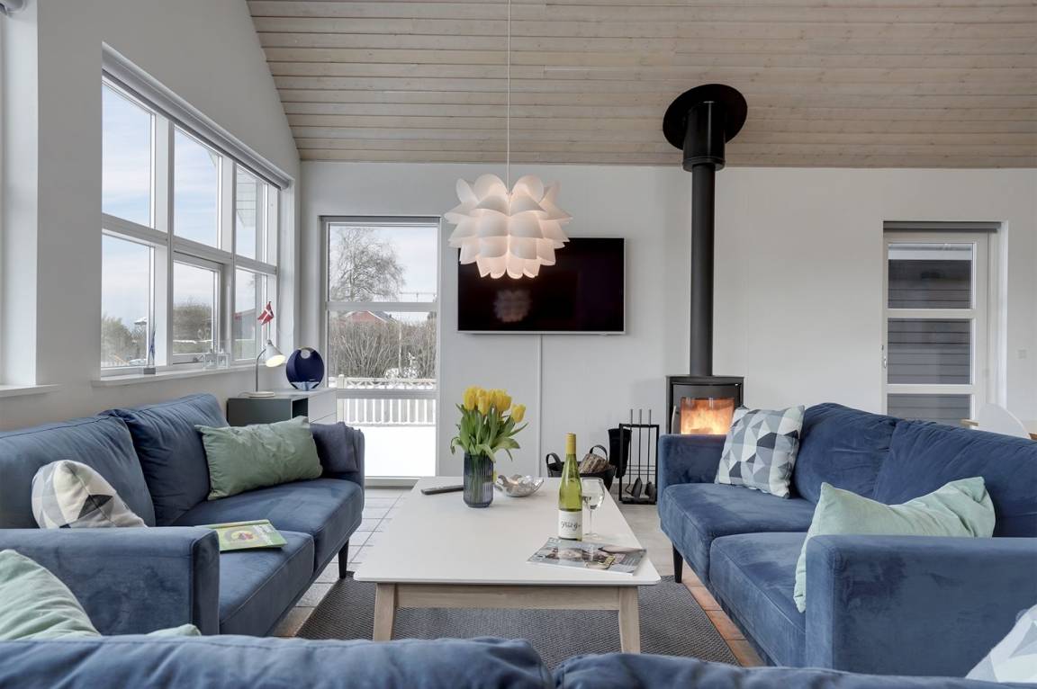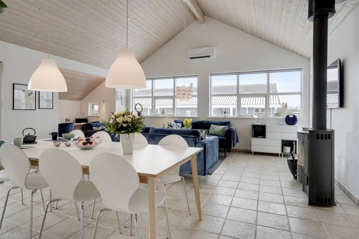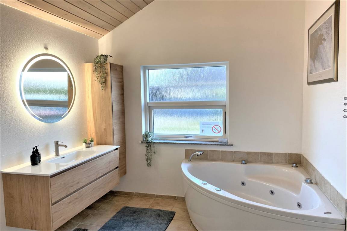 In dem großen Badezimmer gibt es einen 2-Pers.-Whirlpool. Das offene Obergeschoss ist gemütlich eingerichtet mit FATBOY Sitzsäcke, Flatscreen-TV mit der möglichkeit den eigenen Nintendo etc. anschließen können. Das Wohnzimmer, mit Ausgang zur südwestlich gelegenen Terrasse, liegt im Anschluss an die Wohnküche. Die Möbel sind modern und bequem. Das Wohnzimmer ist außerdem mit einem Alkoven eingerichtet, hier können Sie im Homeoffice arbeiten oder die Kids können malen oder Spiele spielen. Es steht ein großer Fernseher mit Smart-TV, ein Bluetooth-Lautsprecher von Harman Kardon, Internet (500/500 Mbit) und ein Kamin zur Verfügung. Eine energiesparende Wärmepumpe sorgt dafür, dass das Ferienhaus auch im Winter benutzt werden kann. Es gibt Terrassen in Richtung Osten, Westen und Südwesten. Das Haus wurde im Herbst 2020 modernisiert.