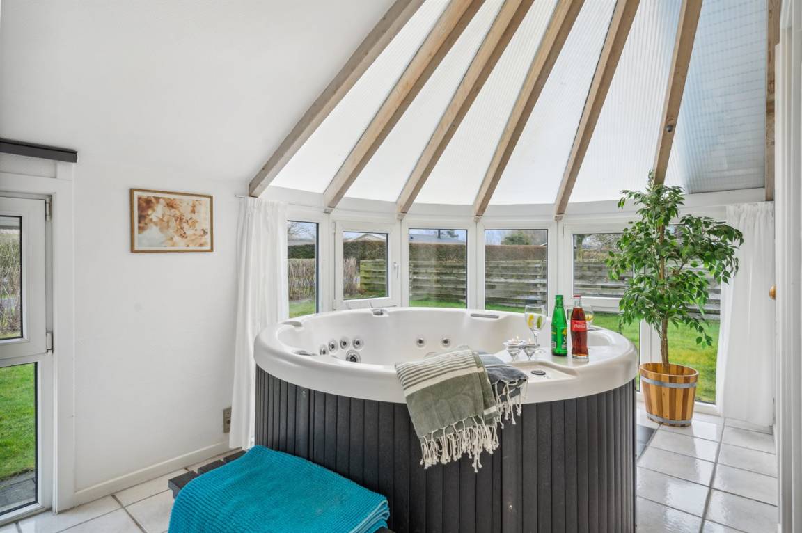 Dieses nette Ferienhaus mit großem Whirlpool und Sauna liegt auf einem großen Gartengrundstück - nur 100 m von einem schönen kinderfreundlichen Badestrand entfernt.