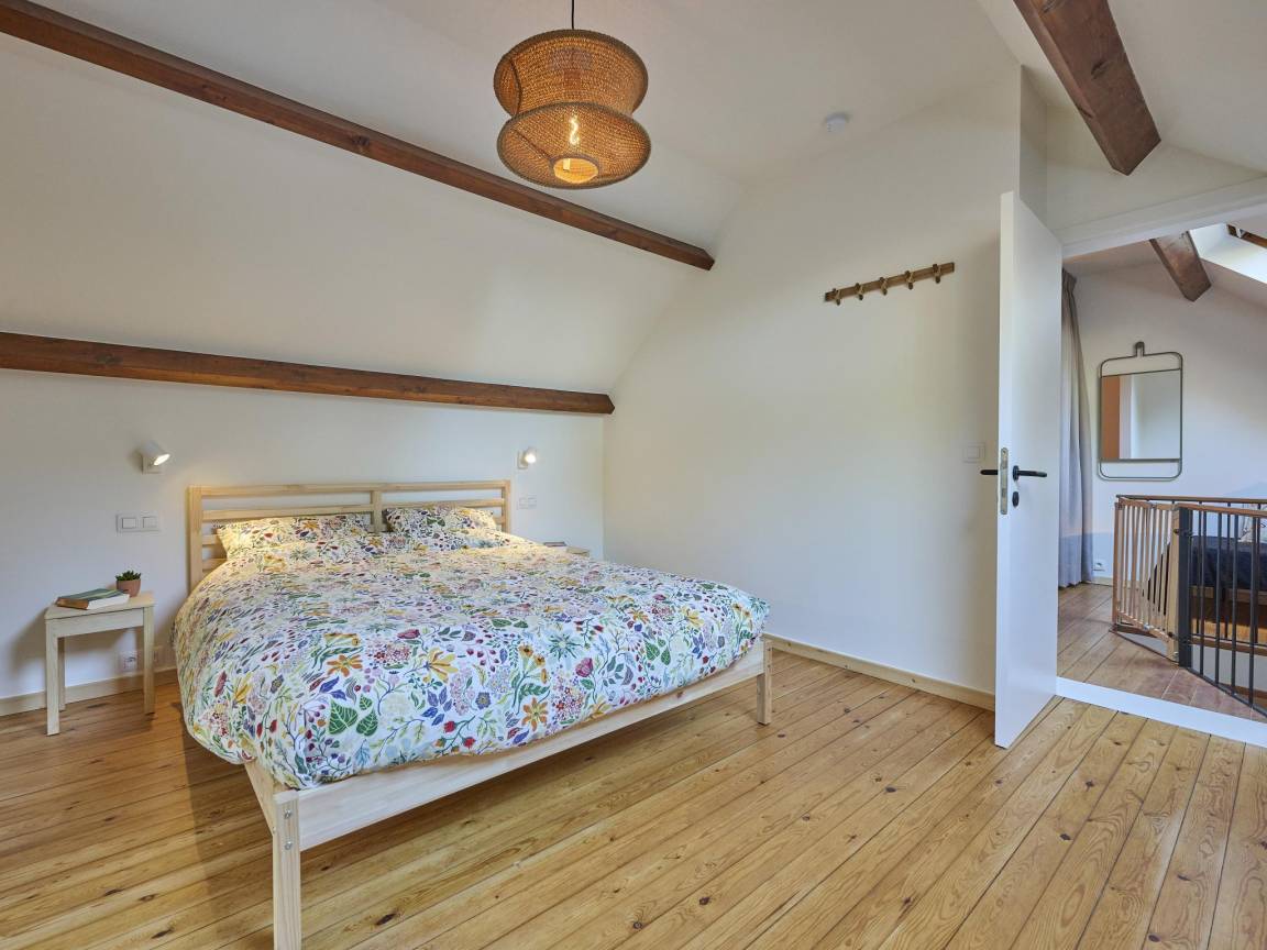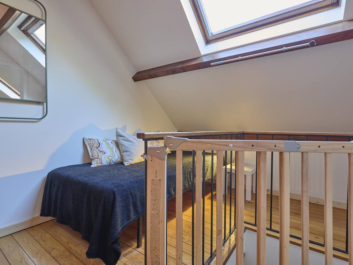 In der 1. Etage(über steile Treppe): Schlafzimmer mit Doppelbett(160 x 200 cm) , Schlafzimmer mit Einzelbett(90 x 200 cm), Doppelbett(160 x 200 cm) , 1x Kinderbett (inklusive Bettwäsche)(gegen Gebühr), Treppenschutzgitter