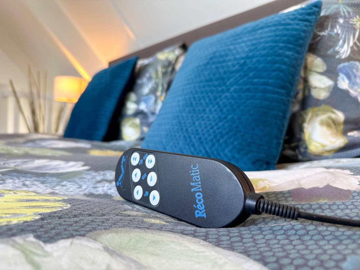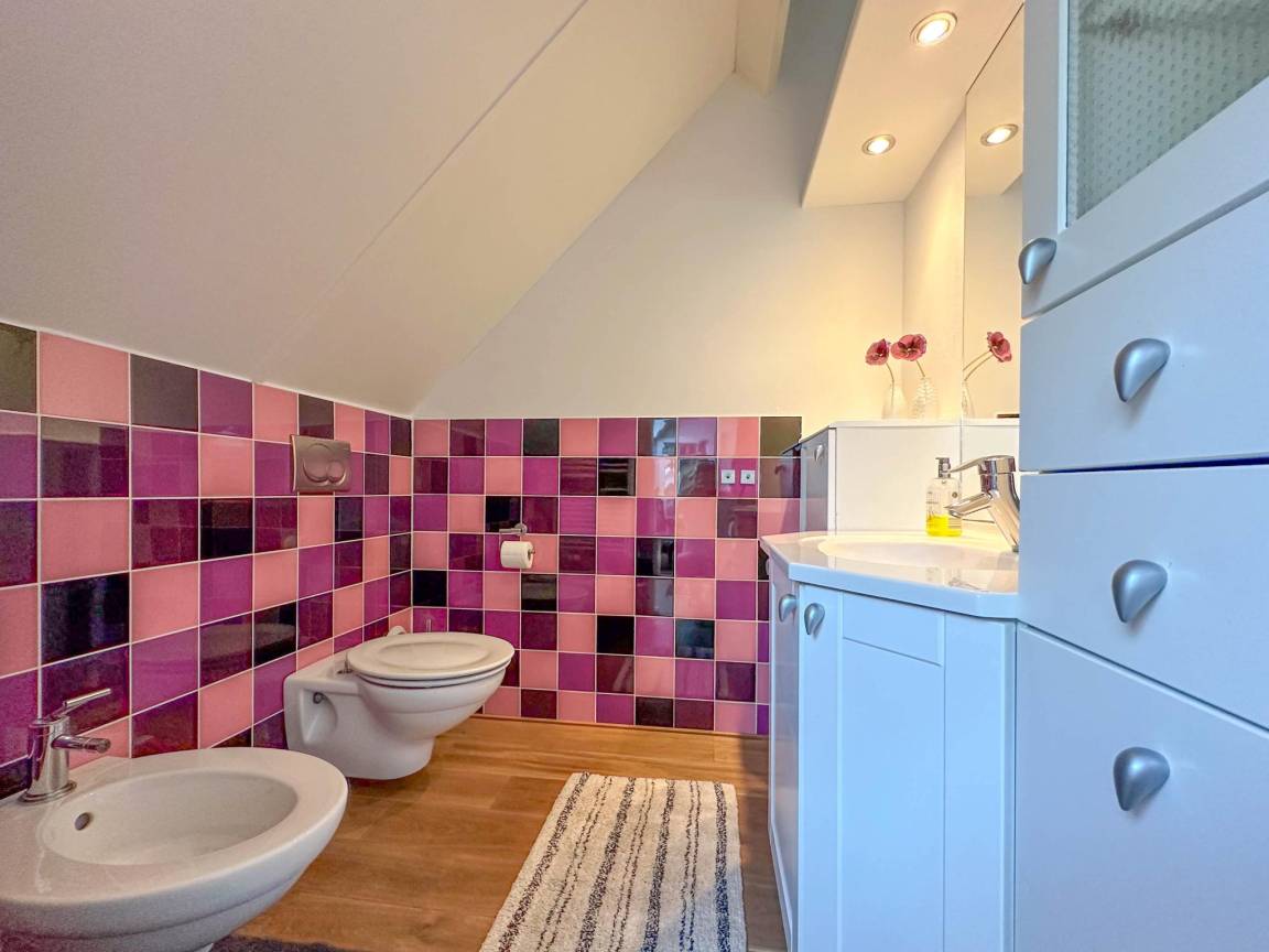 In der 1. Etage: Schlafzimmer mit Doppelbett(elektrisch verstellbar, 180 x 200 cm) , Sanitärraum mit Waschbecken, Toilette, Bidet