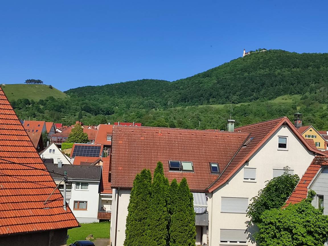 Der überdachte Balkon, mit herrlichem Blick zur Burg Teck,
