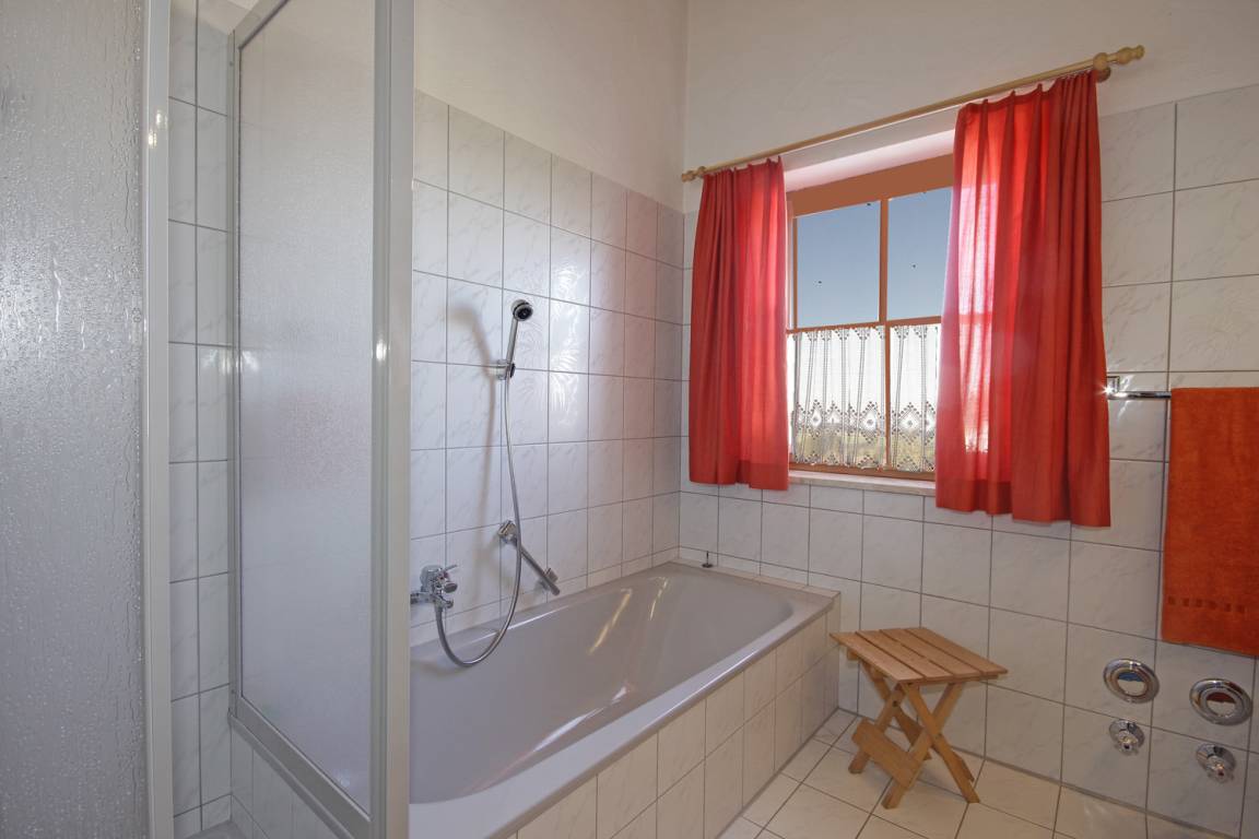 Bad mit Badewanne und Dusche, 2 Waschbecken, Spiegel, Schränke, Fön
