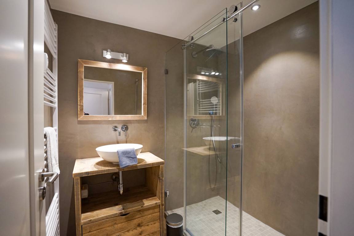 Bad mit Dusche, Waschbecken mit Unterschrank, Spiegel, Designheizkörper und Fön