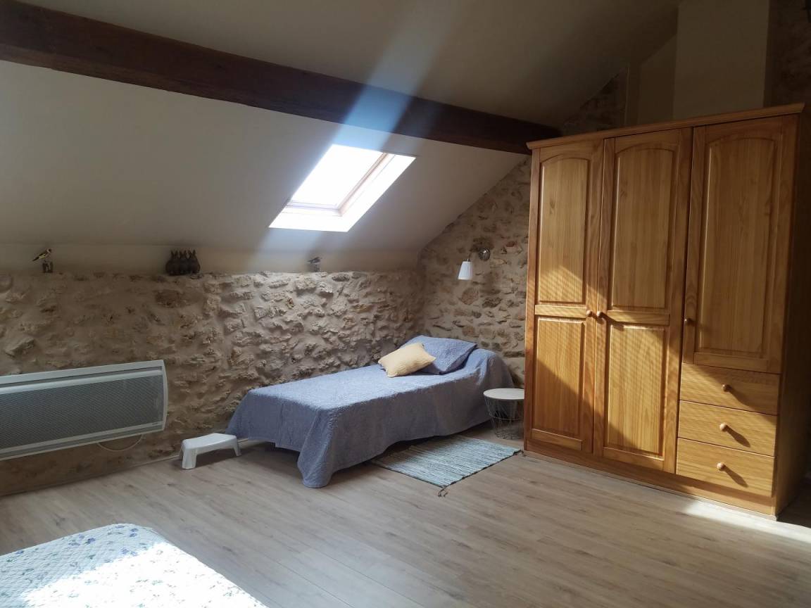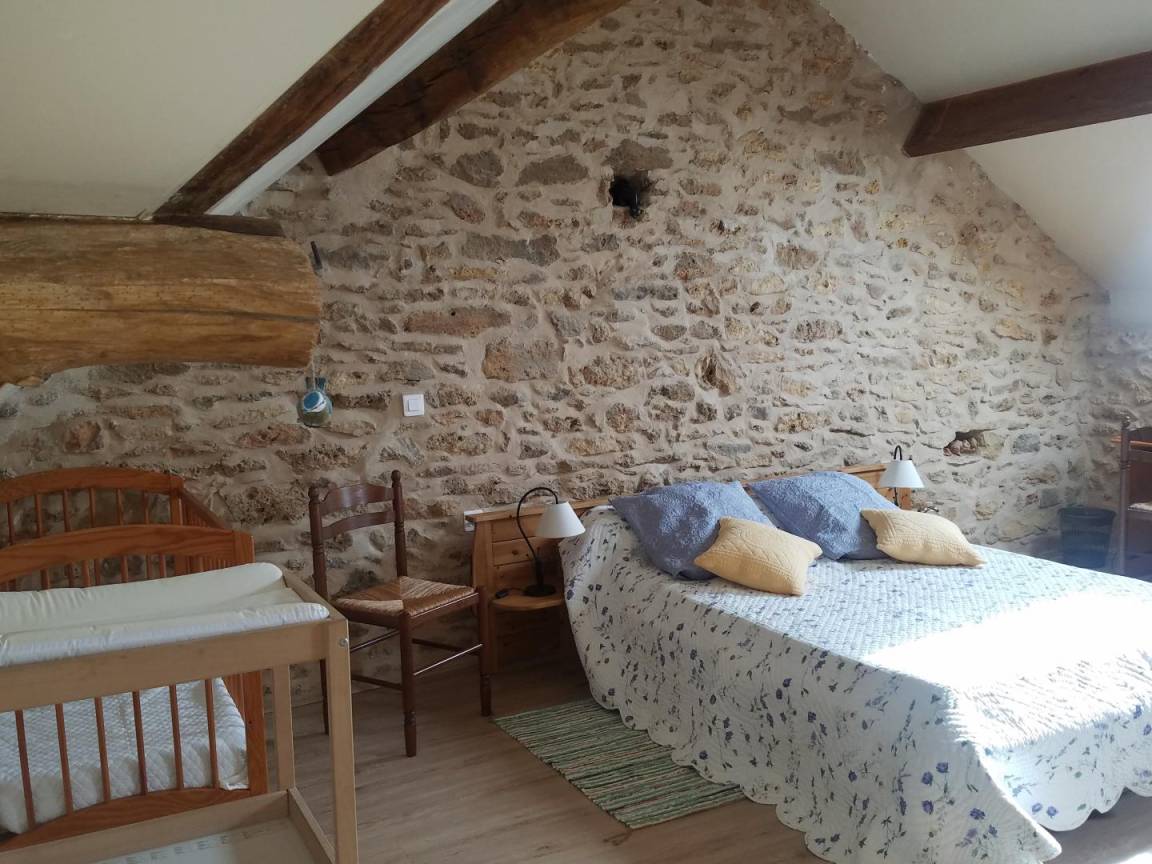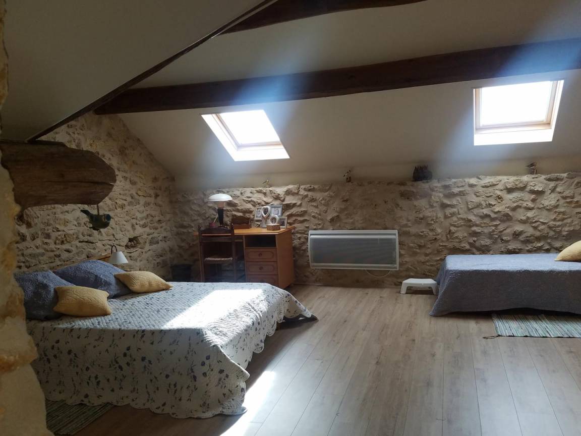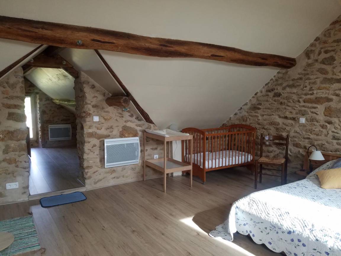 Im Obergeschoss (mit Treppenschutzgitter): ein abfallender Flur mit Kinderspielzeug, der zu einem geräumigen und ansprechenden, 19 m² großen Schlafzimmer mit offenem Grundriss und Dachschräge führt. Es ist mit einem Doppelbett (140 x 190 cm) und zwei Einzelbetten (90 x 200 cm) ausgestattet (Sichtmauerwerk und -balken).
