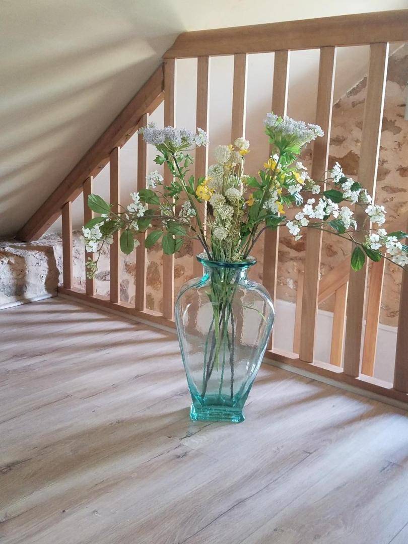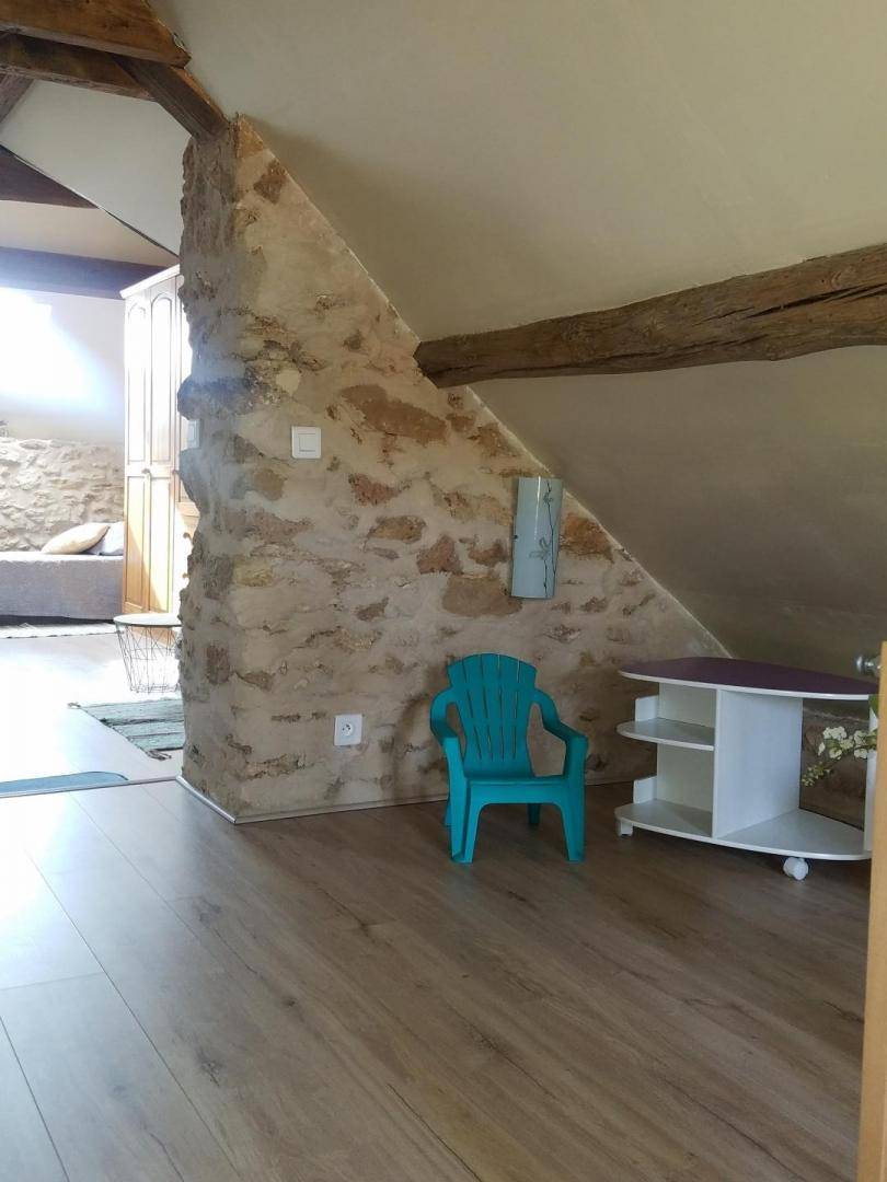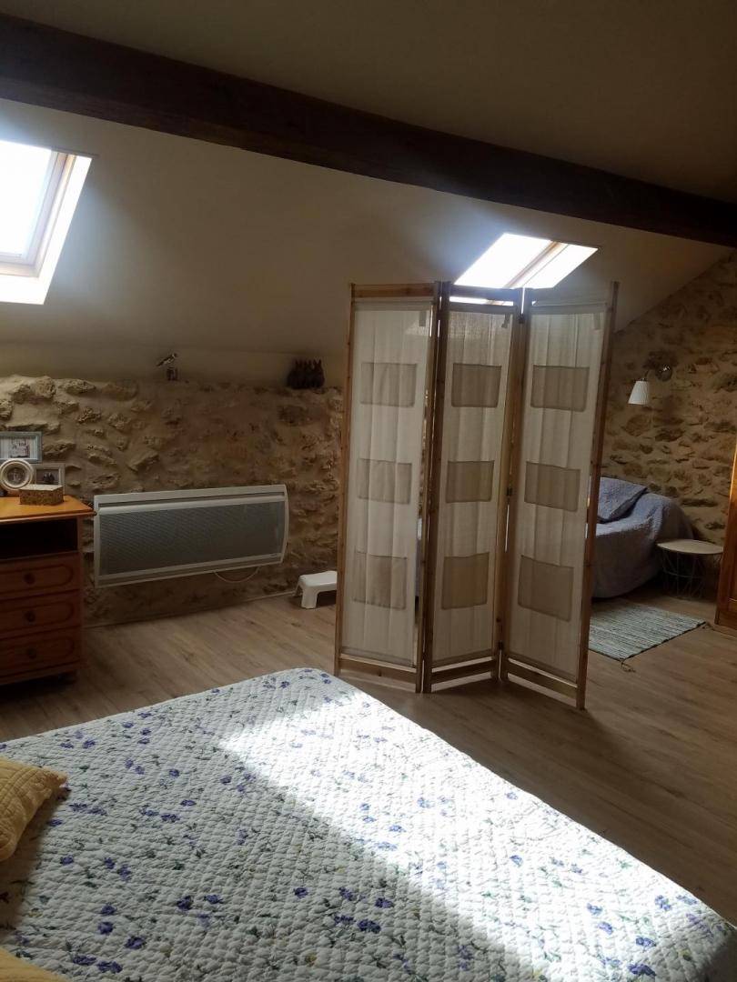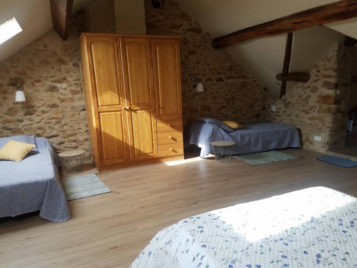 Im Obergeschoss (mit Treppenschutzgitter): ein abfallender Flur mit Kinderspielzeug, der zu einem geräumigen und ansprechenden, 19 m² großen Schlafzimmer mit offenem Grundriss und Dachschräge führt. Es ist mit einem Doppelbett (140 x 190 cm) und zwei Einzelbetten (90 x 200 cm) ausgestattet (Sichtmauerwerk und -balken).
