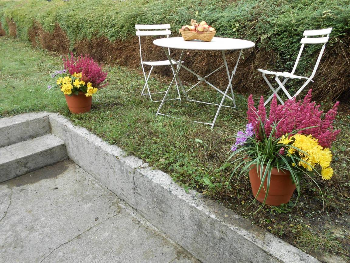 Dieses im älteren Stil erbaute und renovierte Reihenhaus liegt zur Straße hin, 100 Meter vom Haus der Eigentümer entfernt. Es gibt keinen privaten Parkplatz, aber Parkmöglichkeiten an der Straße oder auf einem 50 m entfernten öffentlichen Parkplatz. Hinter dem Ferienhaus, mit Blick auf den komplett umzäunten Obstgarten der Eigentümer