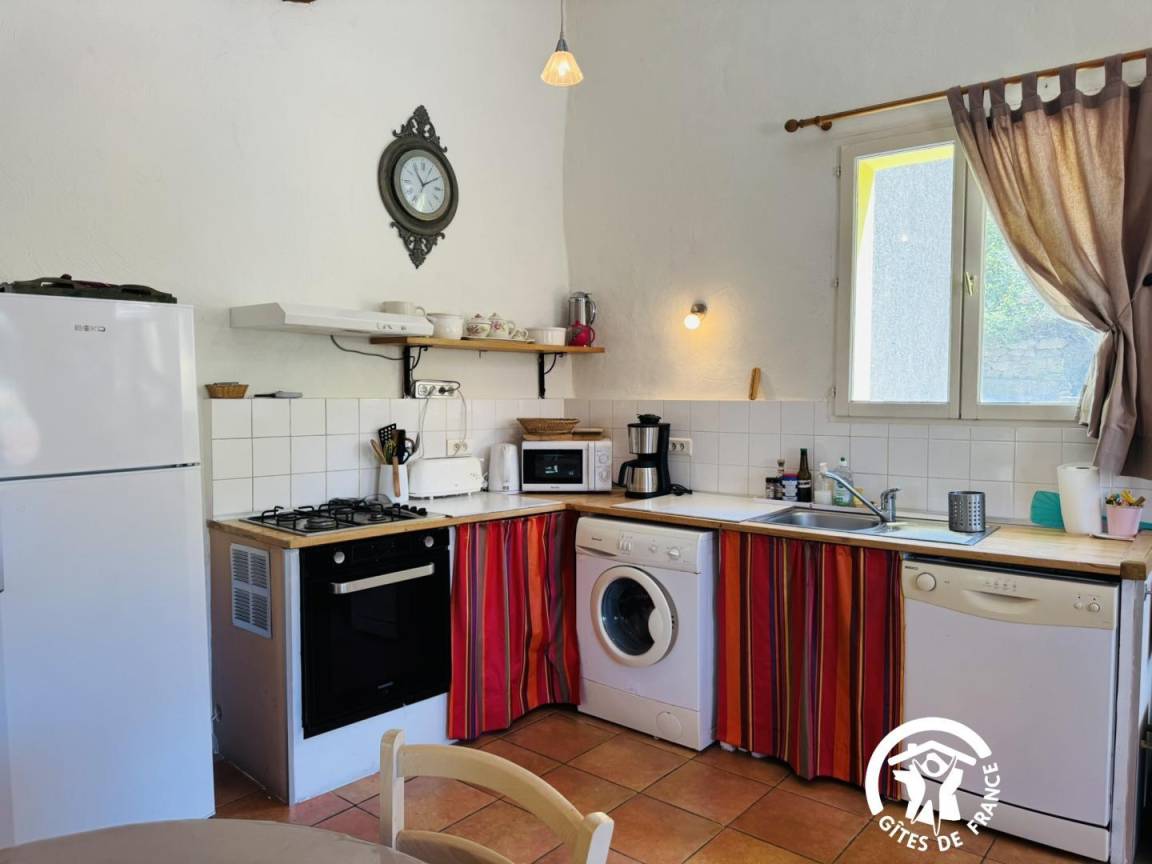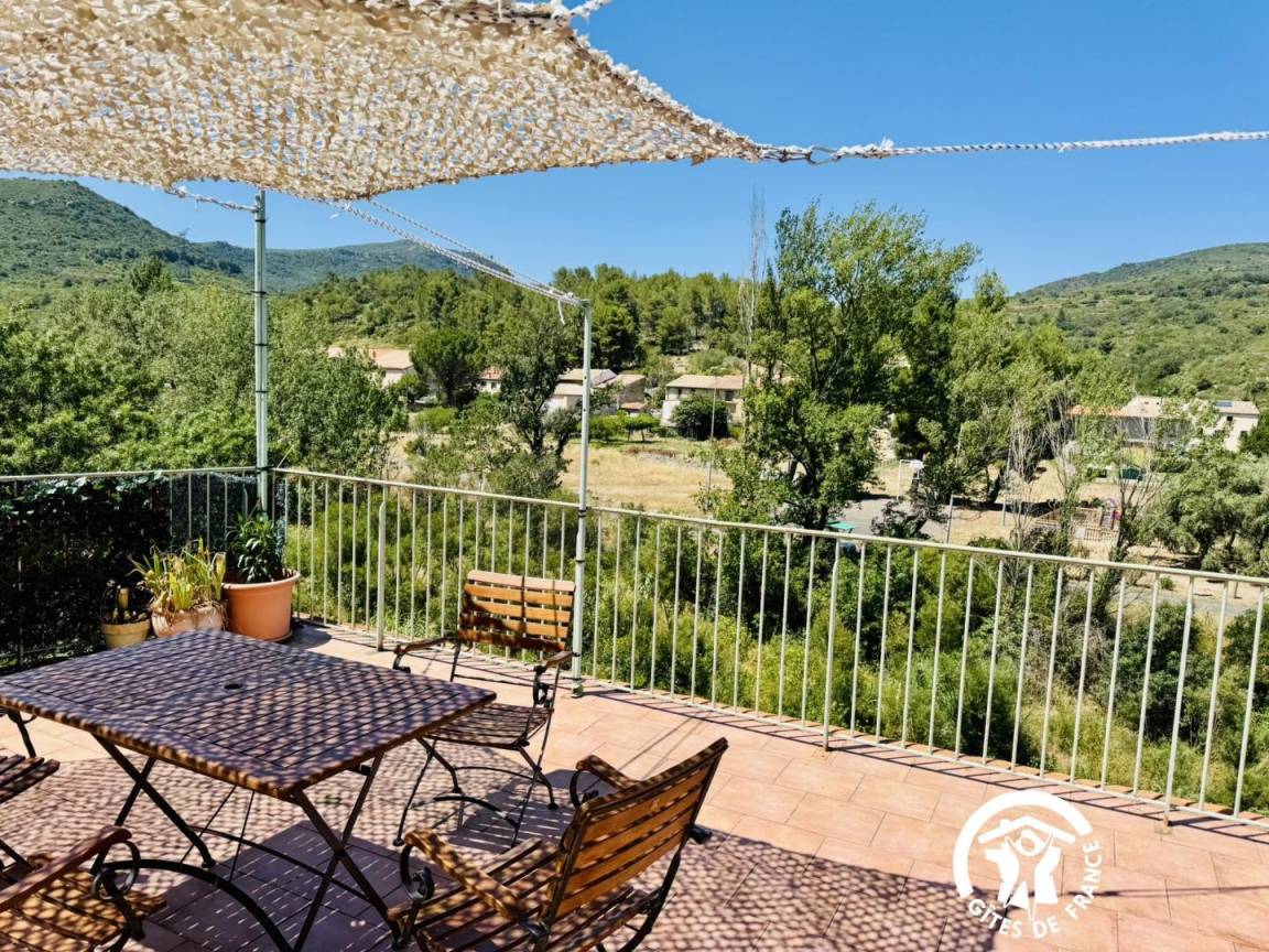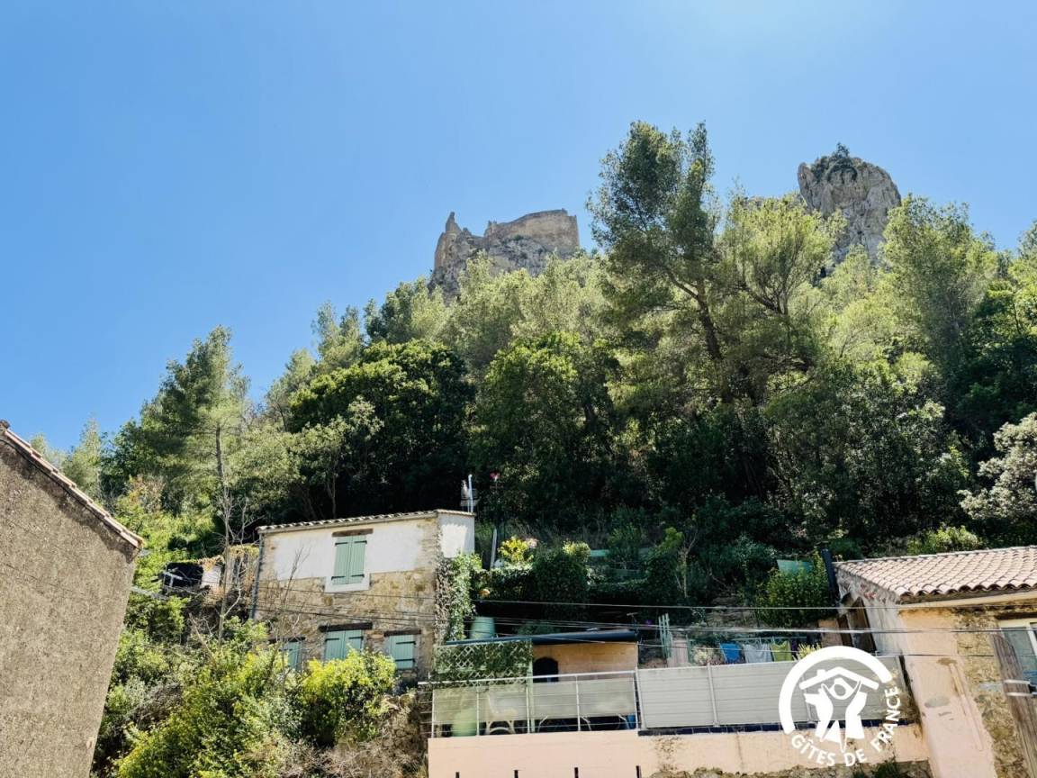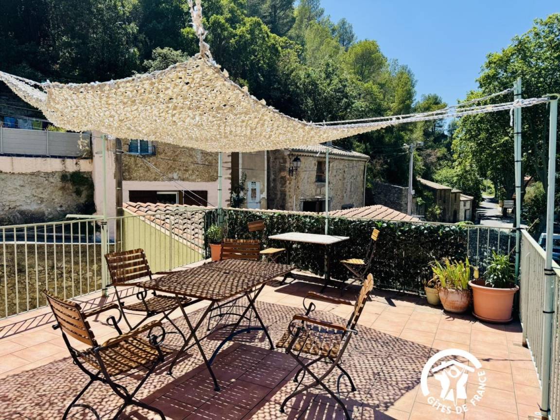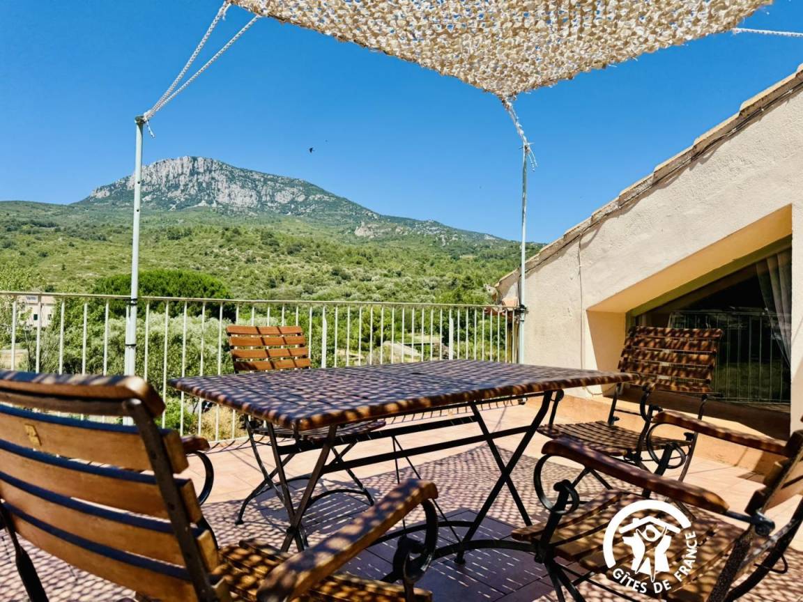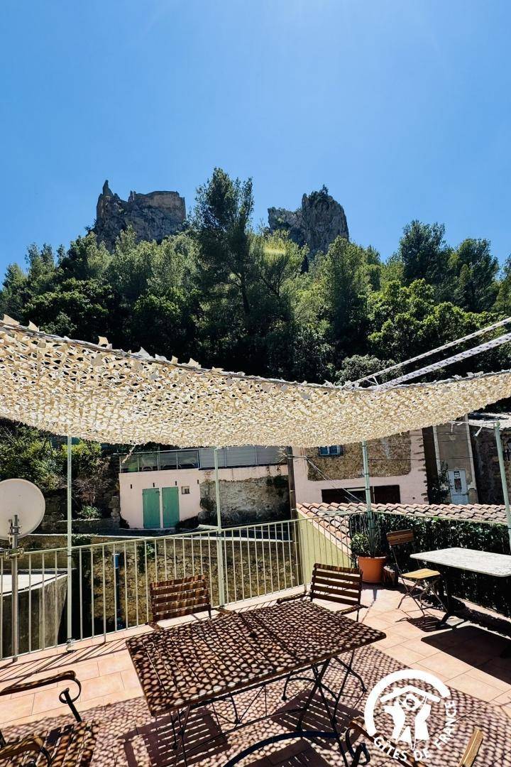 _ Die Panoramaterrasse bietet einen unverbauten Blick auf das Dorf, die umliegenden Hügel, das Schloss und die typische Garrigue-Landschaft. Sonnenliegen, Gartenmöbel, ein Sonnenschirm und ein Elektrogrill sorgen für einen unvergesslichen Aufenthalt.